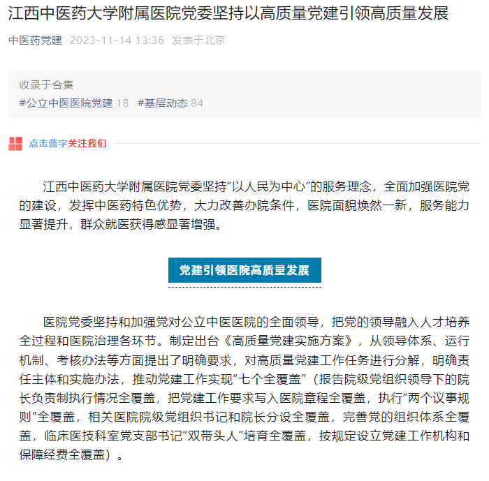 上海中医药大学附属龙华医院江西医院是国家区域医疗中心项目,医院党委把合作共建作为医院高质量发展的重要引擎,对项目实行倒排工期,全力推进。基建办党员阳卫红等坚守一线,和施工方一起,严格对照设计方案,督导抓好每一个施工细节,确保施工质量。同时,积极引入龙华医院新技术、新方法,快速建立起与上海同质化管理体系,显著提升了医院医疗服务能力。