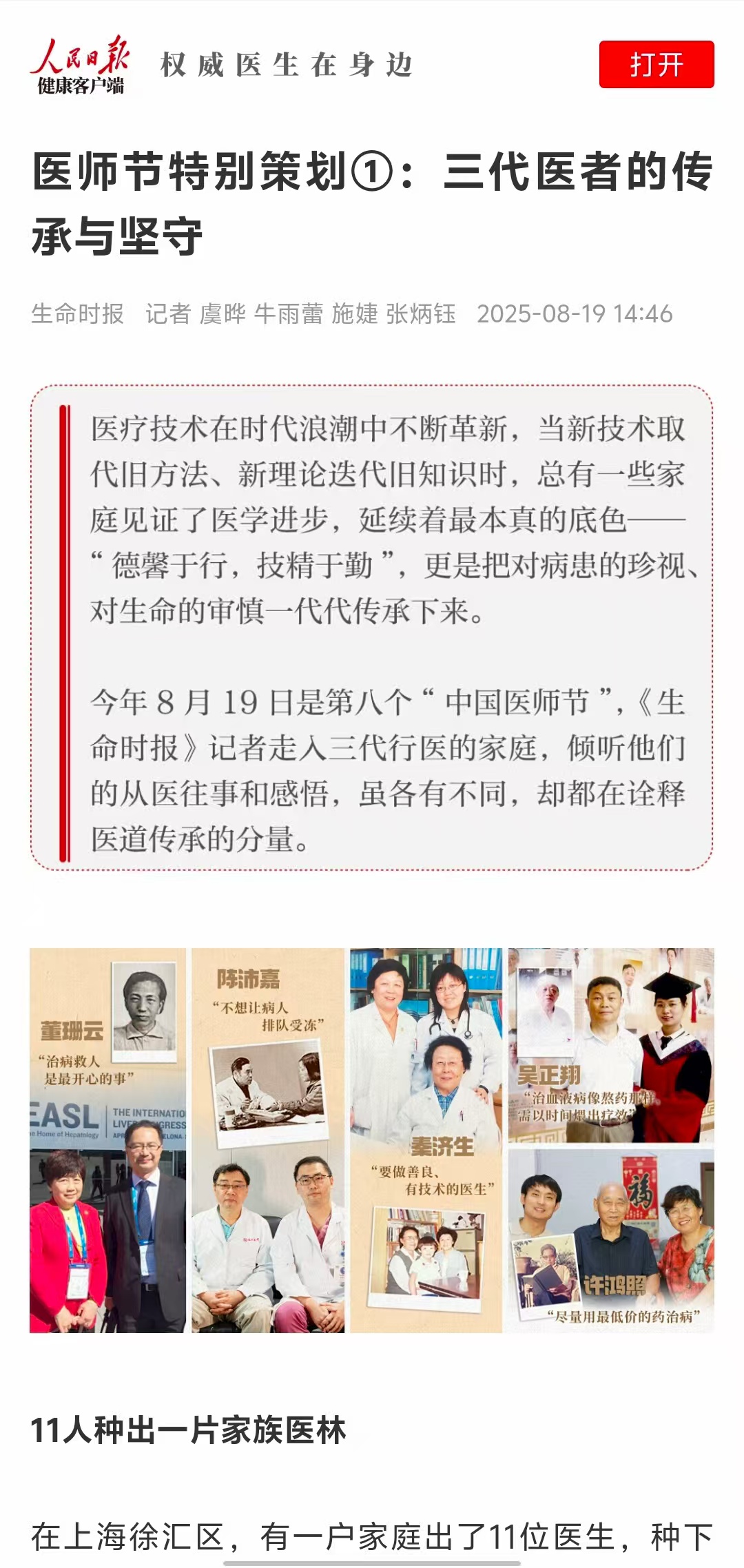 现在,他们每周聚餐一两次,饭桌上聊的永远是病例。“我和母亲、弟弟有个微信群,碰到疑难案例就会在群里讨论。”李海说。在四代人的选择中,“医生”已不是单纯的职业标签,而是家族的共同语言;传承的不是“医生”头衔,而是对初心的坚守、对生命的敬畏。
