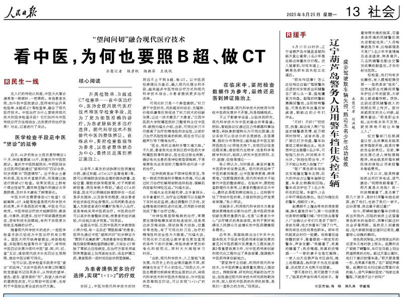 中医为何也需要借助CT检查?任毅解释,CT、B超等检查是现代科学技术的成果,并不是西医的专属,中医也可以使用。中医传统诊疗技术能辨阴阳、察表里、分寒热、别虚实,但对于深部器质性病变,若有科技手段赋能,有利于实现更为细致且准确的诊疗。