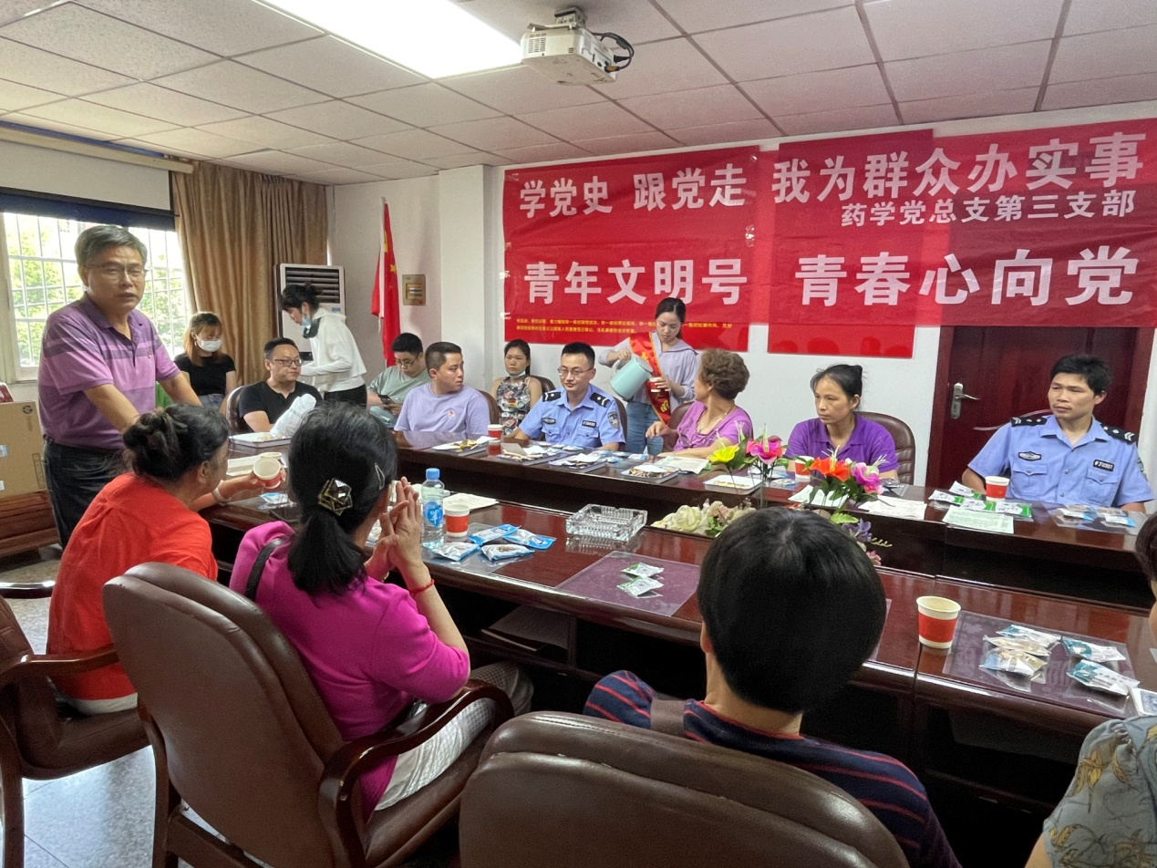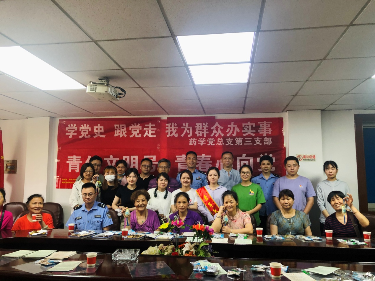 为继续推进党史学习教育,进一步扎实做好“我为群众办实事”实践活动,提高人民群众健康意识,掌握中医药养生保健知识,6月22日药学党总支第三支部携青年文明号集体共同走进南昌市西湖公安分局系马桩派出所,开展了以“中医药文化走进基层民警”为主题的党史活动。