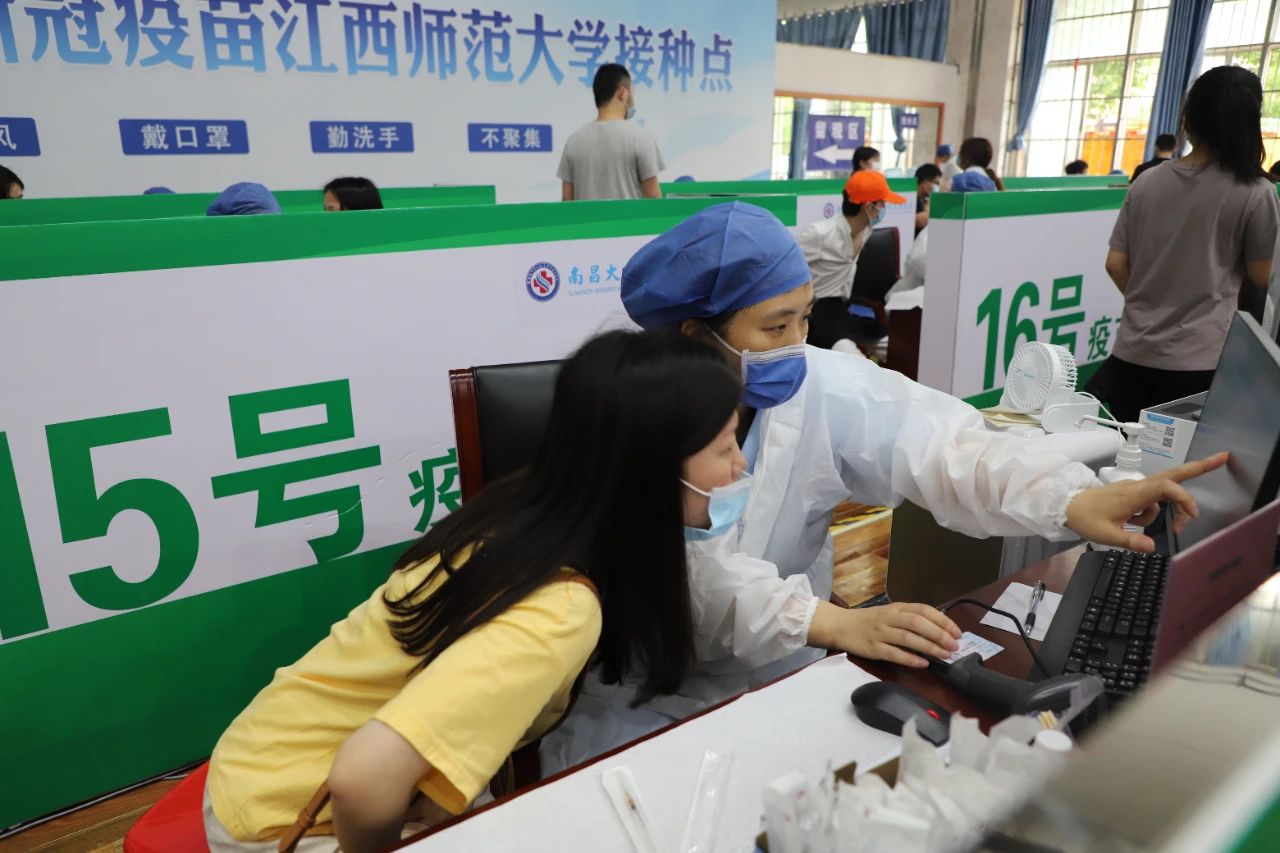 江西师大瑶湖校区长胜体育馆内,在志愿者的引导下,市民们自觉排队,等待接种新冠病毒疫苗,现场井然有序。20余个接种台上,接种护士快速而有条不紊地完成一个又一个疫苗接种。“最近有接种过其他疫苗吗?身体有没有不舒服?有发烧吗?有过敏吗?”“请确认一下个人信息”“请拿好接种单和身份证到留观区观察30分钟,最近三天饮食要清淡,不要饮酒,接种当天不要洗澡,接种手臂不要提重物……”接过身份证,问询,确认信息,扫描疫苗码,打针,叮嘱注意事项,护士们头也不抬地快速重复手上的动作,口上不停地叮嘱着注意事项,整个接种过程不超过两分钟。