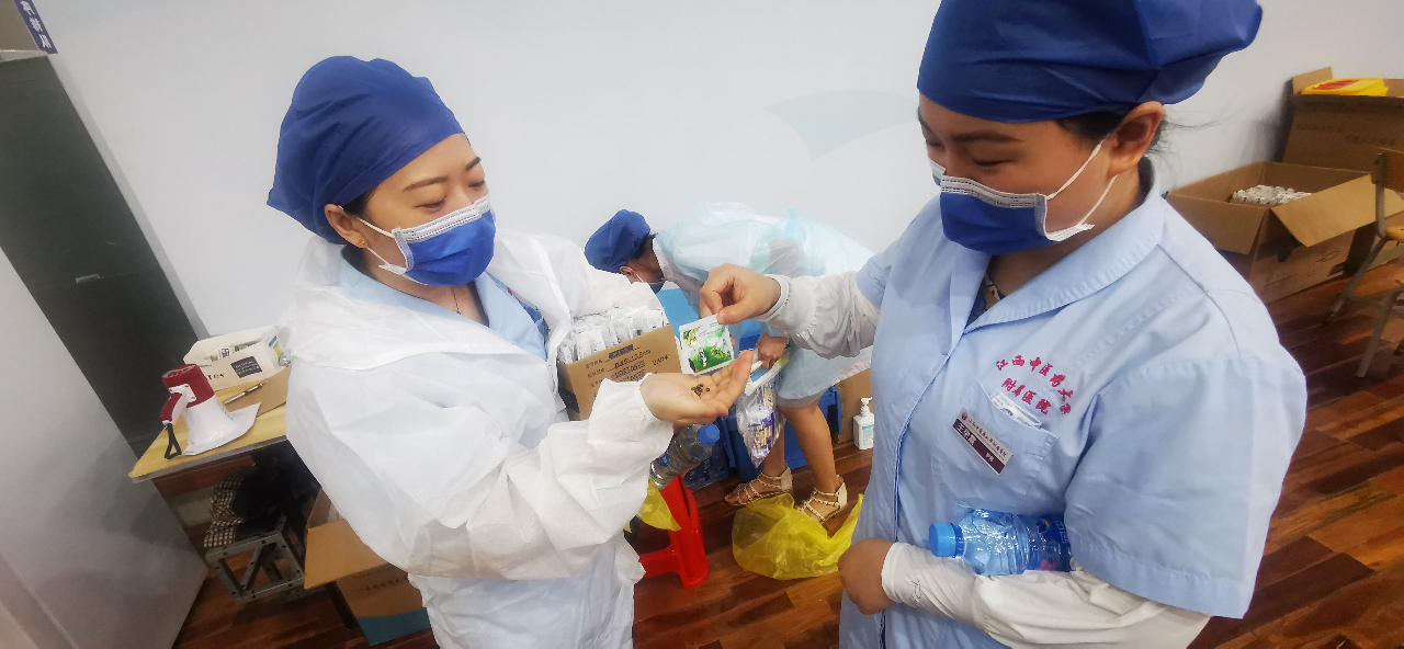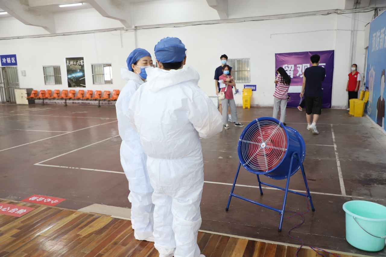 为提高接种速度、减少居民等待时间,接种护士争分夺秒,尽量少喝水、少上厕所,穿着闷热的隔离服,半天的时间工作衣基本上就被汗浸透了。因为方舱内没有安装空调,随着几日连续的高温天气,开始有接种护士出现了中暑的症状,去处置室做了简单处置后,继续回到岗位上工作。为了防止中暑,接种人员在接种之前先吃人丹和藿香正气水进行预防。