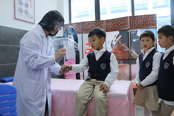 除了课堂上的授课外,临床医学院的学生志愿者们还与小朋友们一起观察了一些常见的中药材,并进行了艾灸体验活动。