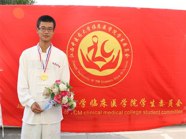 虽已入秋,暖阳胜夏,温暖的阳光给他披撒上一层金色的外衣,仿佛也在为他争夺桂冠而庆贺并献上最真挚的祝福。他,16中西医临床3班的卢俊峰同学,在学男甲组跳高比赛中获得冠军,同时也为我们临床院夺得首金。