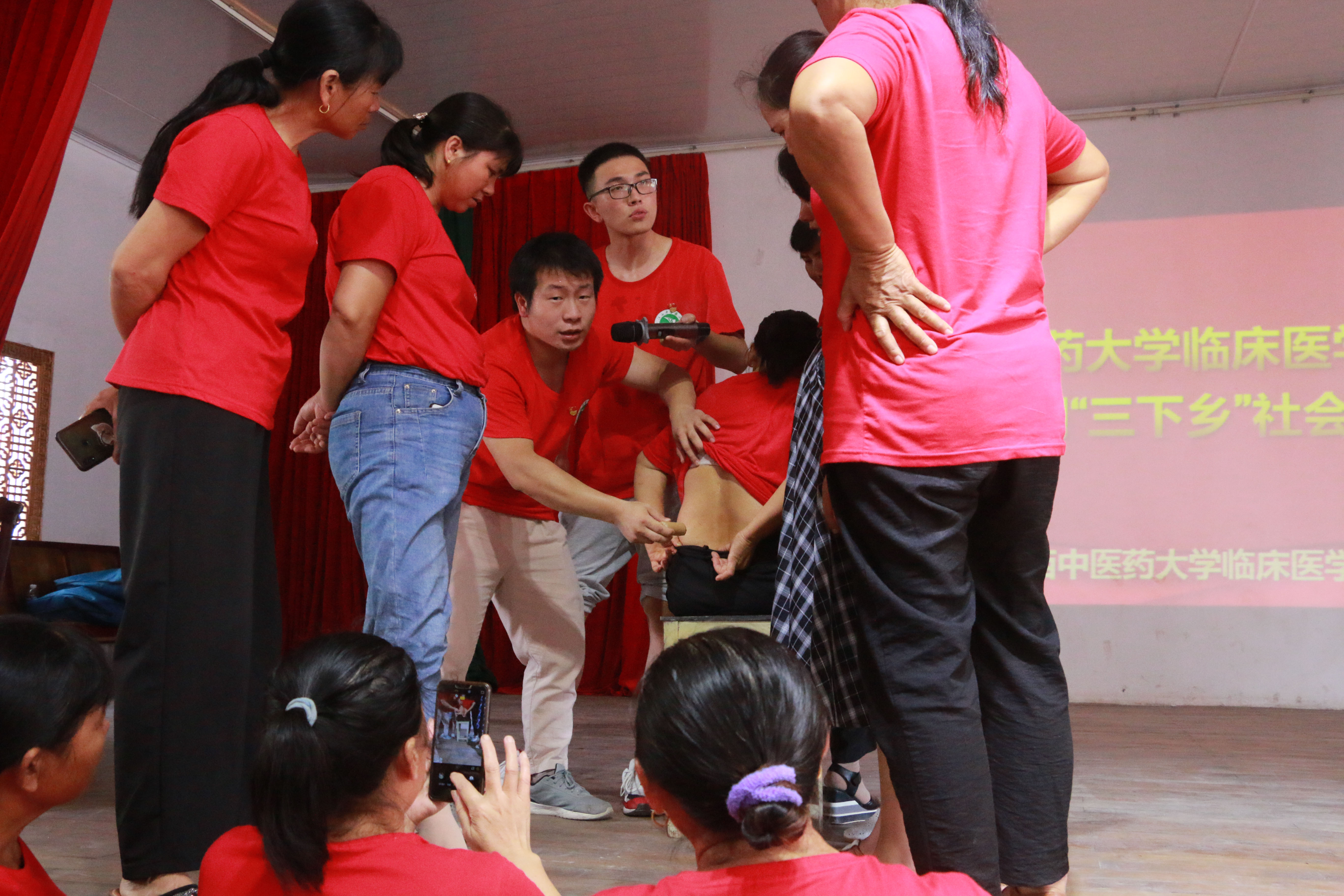 为了增强授课效果,培训结束后,队员们使出浑身解数,熟练运用专业知识为村民们进行现场体验。他们手法娴熟,温和灸、雀啄灸、回旋灸、寻经往返灸……短短的艾条在队员们细致地操纵下恰至病处,礼堂里艾香氤氲,烟雾缭绕,香气扑鼻。每一缕燃艾的青烟,每一处推拿的穴位,无不体现出热敏灸和中医推拿独特的魅力。此次培训及体验活动的开展,积极响应了省委省政府关于大力发展中医药的号召,将热敏灸、穴位推拿按摩等传统中医养生之术推广到基层,为中医药文化的传播贡献了一份力量。