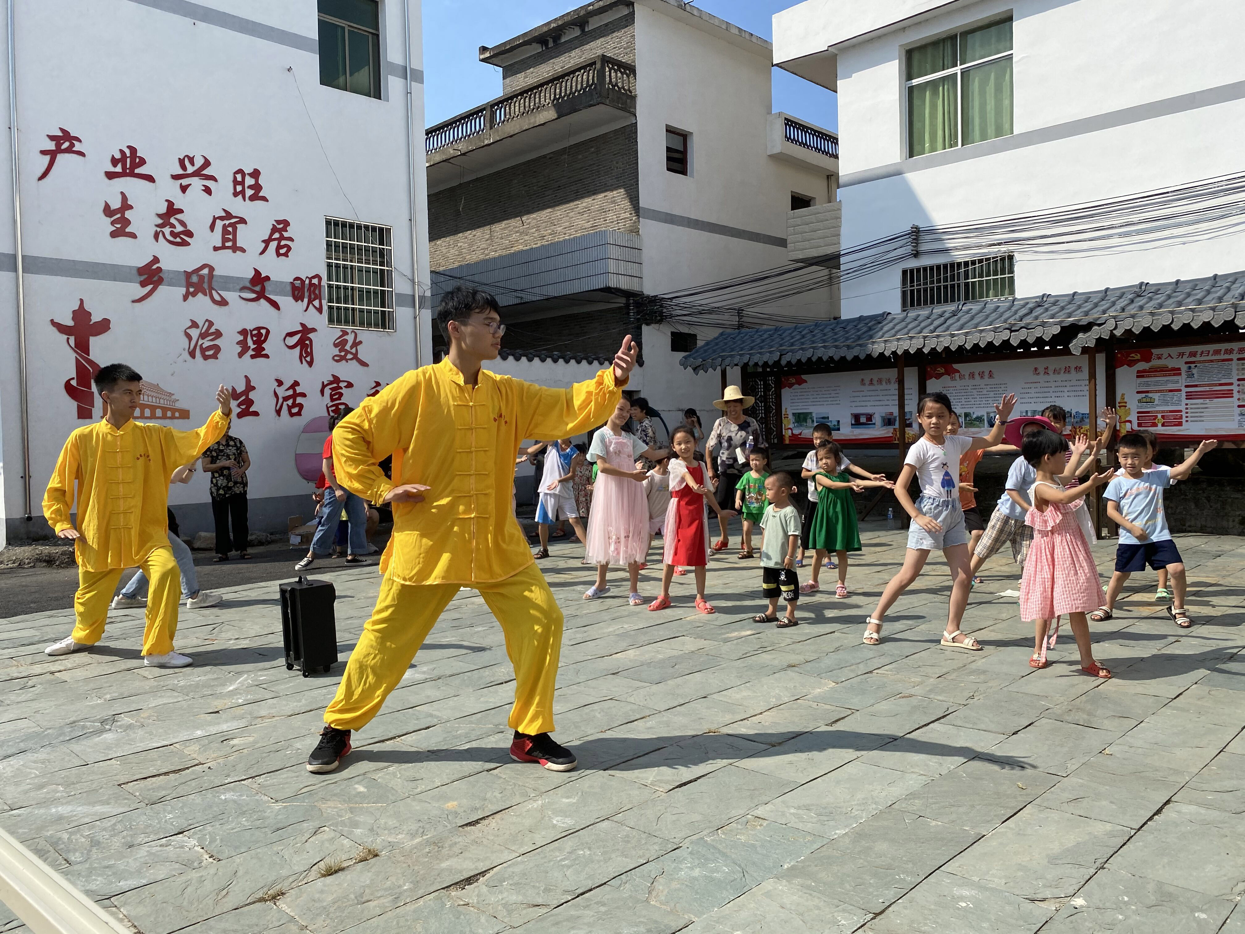 在康养中心外,服务队队员身着黄色太极服,为村里的小朋友们上演了一场太极拳功法教学。“左右野马分鬃”“白鹤亮翅”“揽雀尾”……一招一式对小朋友们来说陌生又有趣的功法在队员们的演绎下活灵活现地展示出来,激发了小朋友们的好奇心。他们也随着古典优雅的太极音乐挥舞着小手,挪动着脚步,动作虽然青涩稚嫩却能在他们的脸上看出浓厚的兴趣,也能从他们每一个摆臂间看到岐黄导引之术和中华优秀传统文化的代代传承。