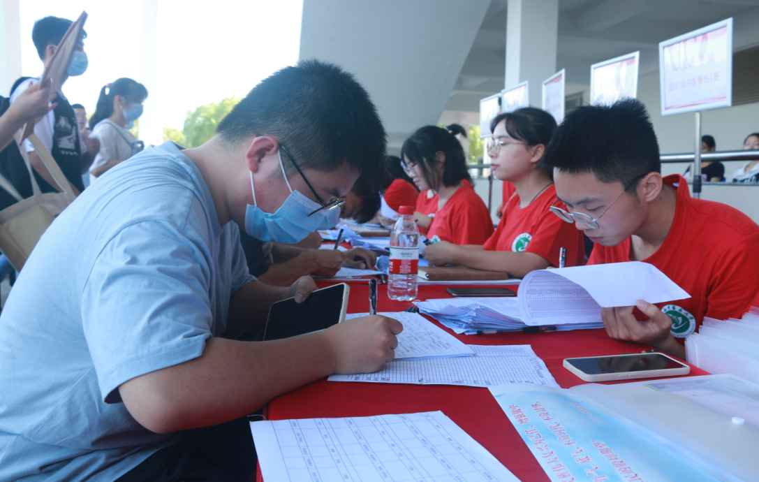 早晨7时,各班班助及志愿者们抵达临床医学院新生报到点,有条不紊地进行准备工作。烈日炎炎,挡不住莘莘学子报名的热情脚步,新生们在志愿者的引导下来到学院报到点,在班助的协助下完成报到的所有手续。