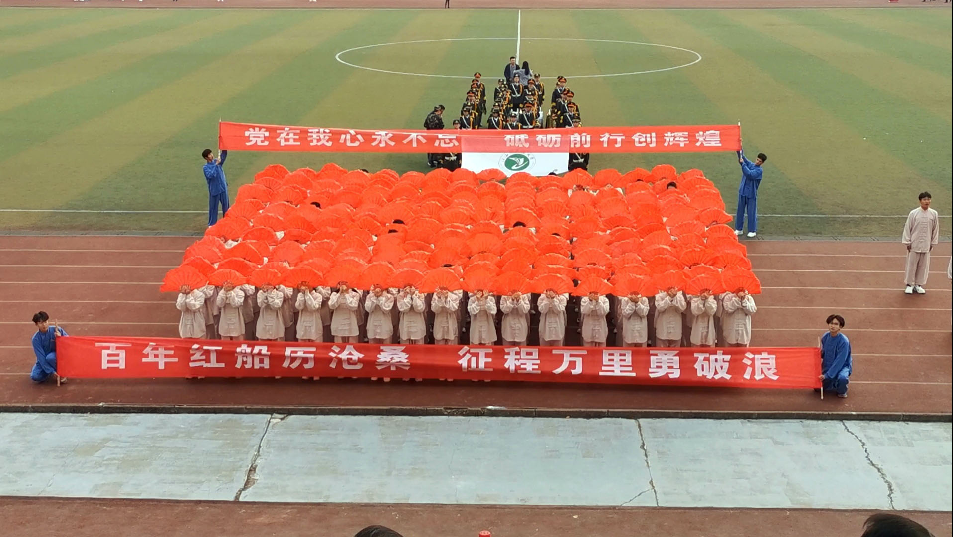 上午8时30分,各方阵队伍陆续入场。临床医学院代表队的208名学子,身着米白色太极服,雄赳赳气昂昂,昂首阔步,踏上赛道。主席台前,随着口令员的一声令下,队员们迅速变换阵型,用手中的红扇依次呈现出“红船”“1921”“2021”及党徽的图样,配上“百年红船历沧桑,征程万里勇破浪” “党在我心永不忘,砥砺前行创辉煌”等横幅标语,彰显了临床学子对敢为人先、勇往直前之精神的向往。“请党放心,强国有我”的响亮口号是临床学子忠诚于党和国家的坚定誓言,三声“临床临床,再创辉煌”更是响彻全场,气壮山河。