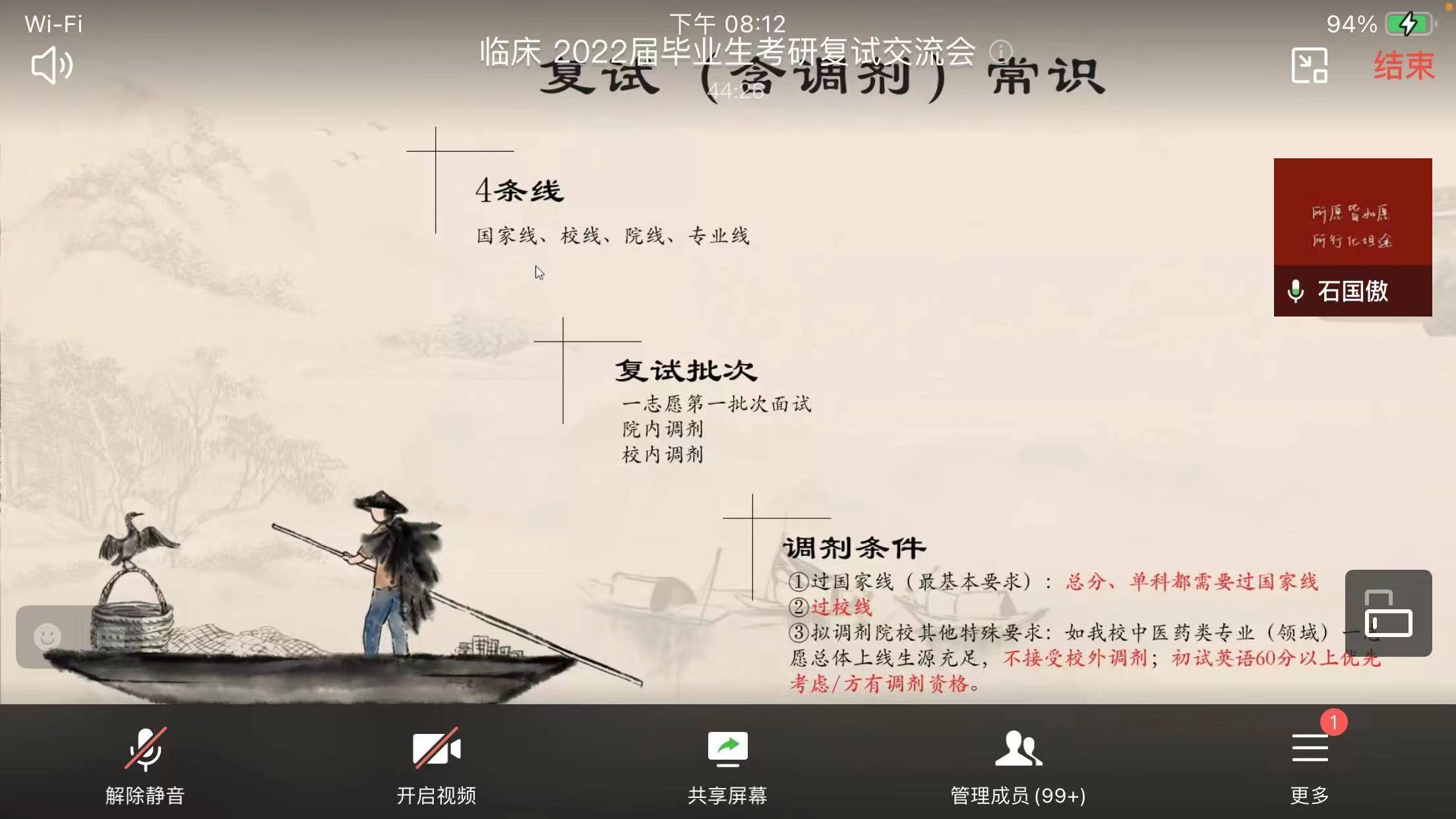 本次考研交流会,临床医学院邀请了胡勤学、李海山等6位往届优秀学子为2022届考研学生答疑解问。他们结合自身经历,从专业课程、面试问题、复试调剂等多方面为2022届考研学生进行了详细的解答与分析。交流分享会上,学子们分别从复试流程、复试形式、复试时需要注意的问题以及复试前的准备四个方面提出了指导性建议。并提醒学弟学妹们平时要多加提升临床技能,提高基础知识的储备。复试中要保持积极良好的心态,坚定自己的目标。