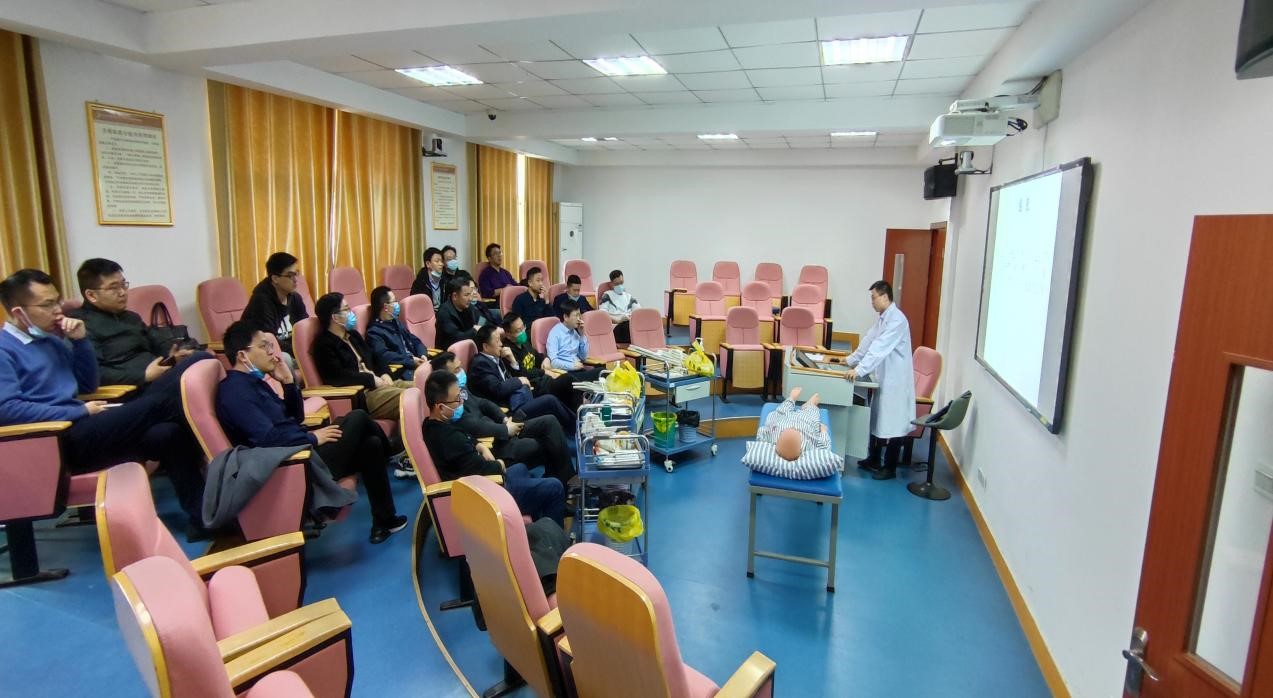 图为3月11日上午阳明技能中心425教室,中西医结合外科学教研室宫再兴主讲,开展《外科操作》教师培训。