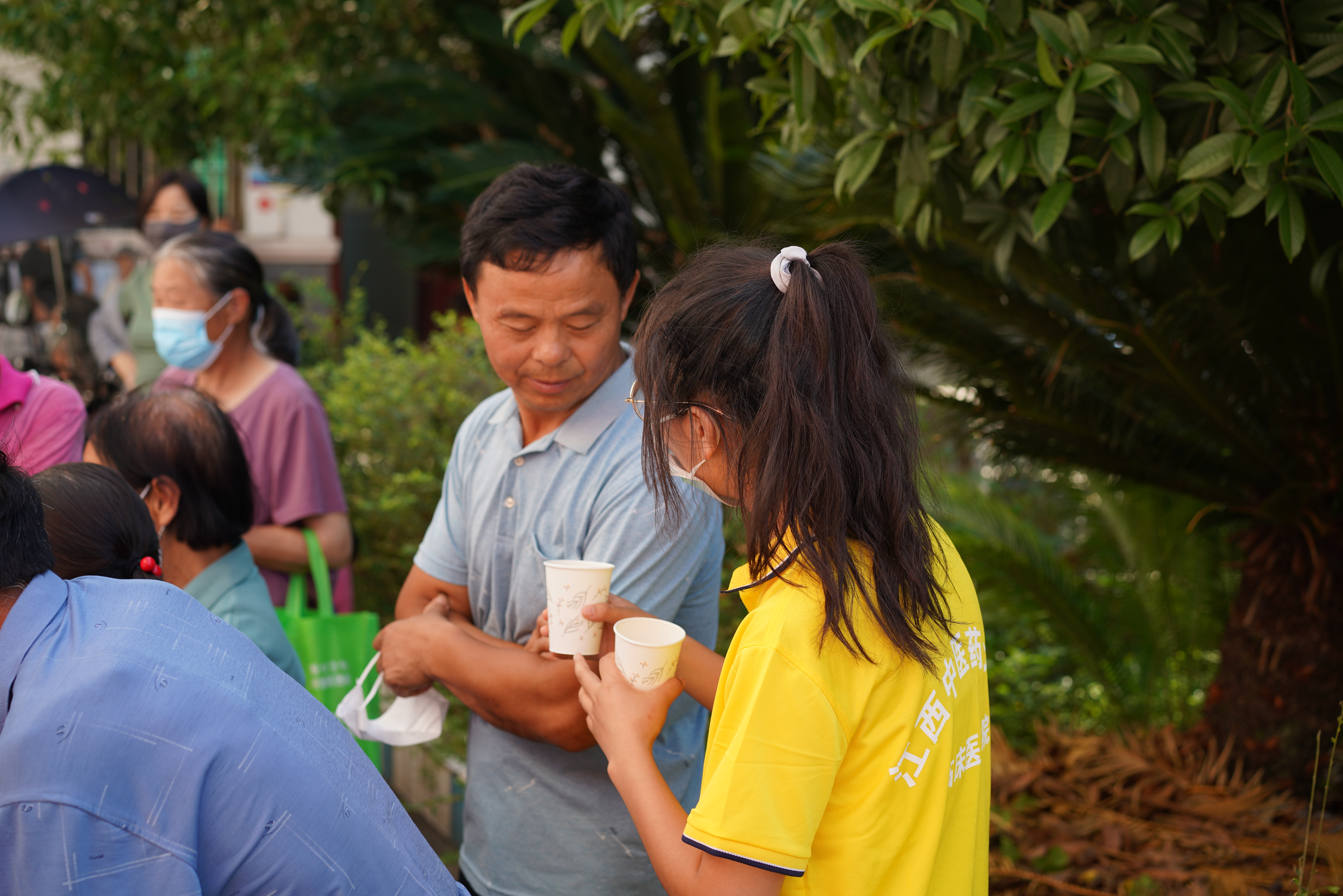服务队为村民带来了不少独具中医药特色的医疗服务:一方小桌,两只巧手,队员们用熟练的推拿手法为村民们松解肌肉,缓解酸痛;艾条徐燃,灸香四溢,不断游走在经络的艾条行气止痛,扶阳固脱。此外,广场一角,不断有人测量血压;广场之中,也有不少队员携着问卷,开展高血压高危因素的调查,队员们用通俗易懂的言辞向他们普及中医“未病先防,既病防变,瘥后防变”的治未病思想。炎炎夏日,耗气伤神,服务队成员们也为等待的村民递上了一杯生津止渴的花茶。