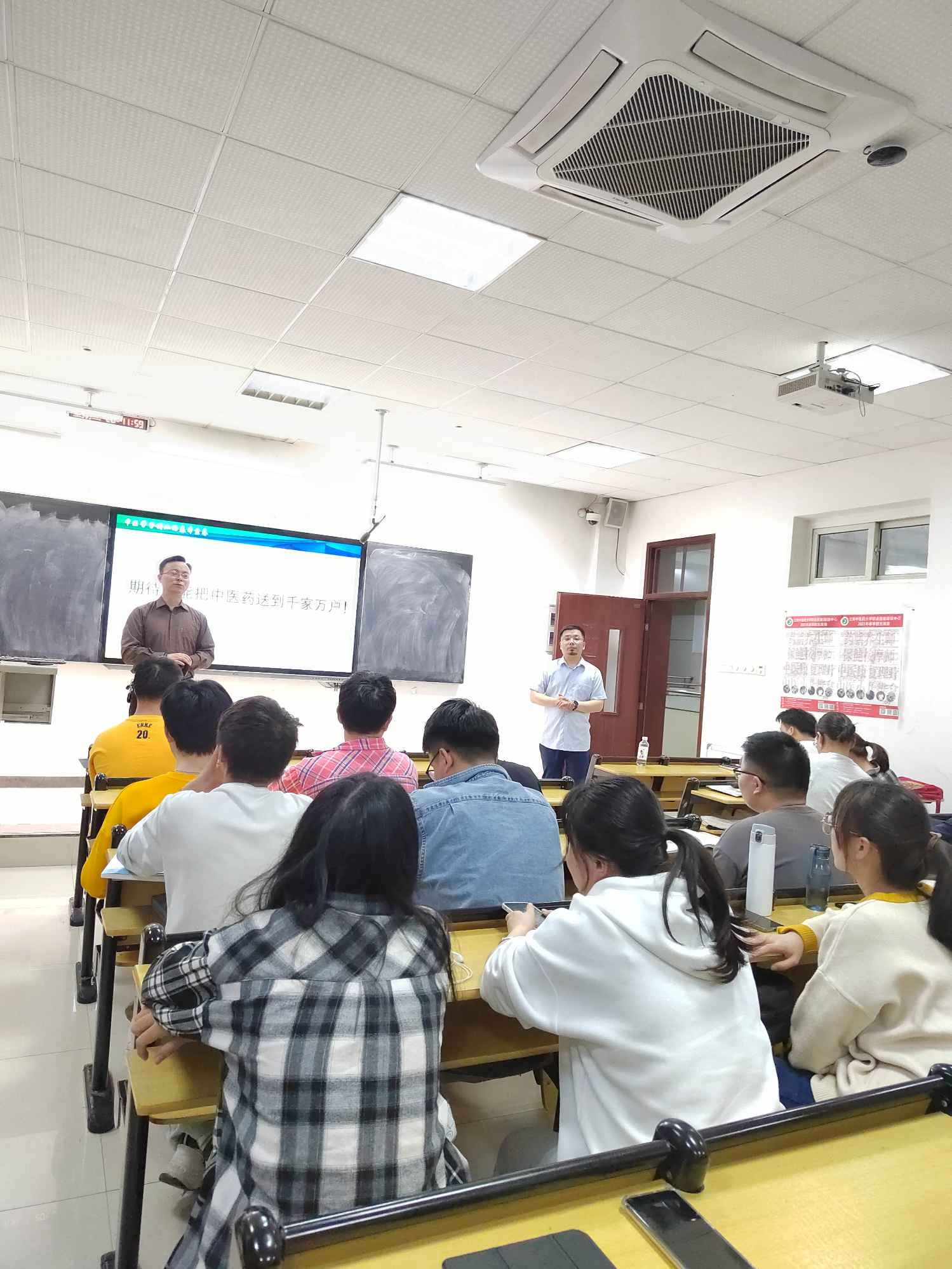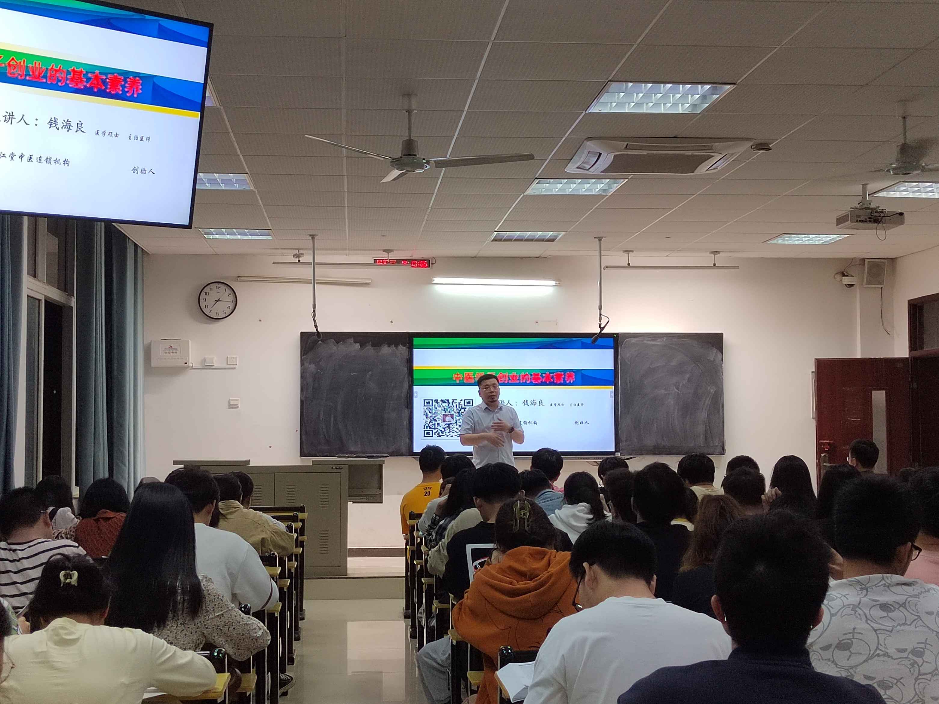 讲座中,钱海良老师主要从创业意识、创业品质、创业能力三方面详细讲解了创业所需具备的基本素养。除此之外,钱海良老师结合自身经验向大家分享了许多实际案例,让大家更加直观清楚地了解到创业素养的必需性。紧接着,针对大家提出的创业问题,钱老师从多方面、多角度地分析了中医学子在创业过程中的特点和优势,指出在创业过程同学们应在医疗技术上懂技术善创新;在社会政策上抓机遇敢决策;在医学人文等方面拥有综合素养。整场讲座中钱老师深入浅出的讲解引来现场掌声不断,同学们深感受益匪浅。