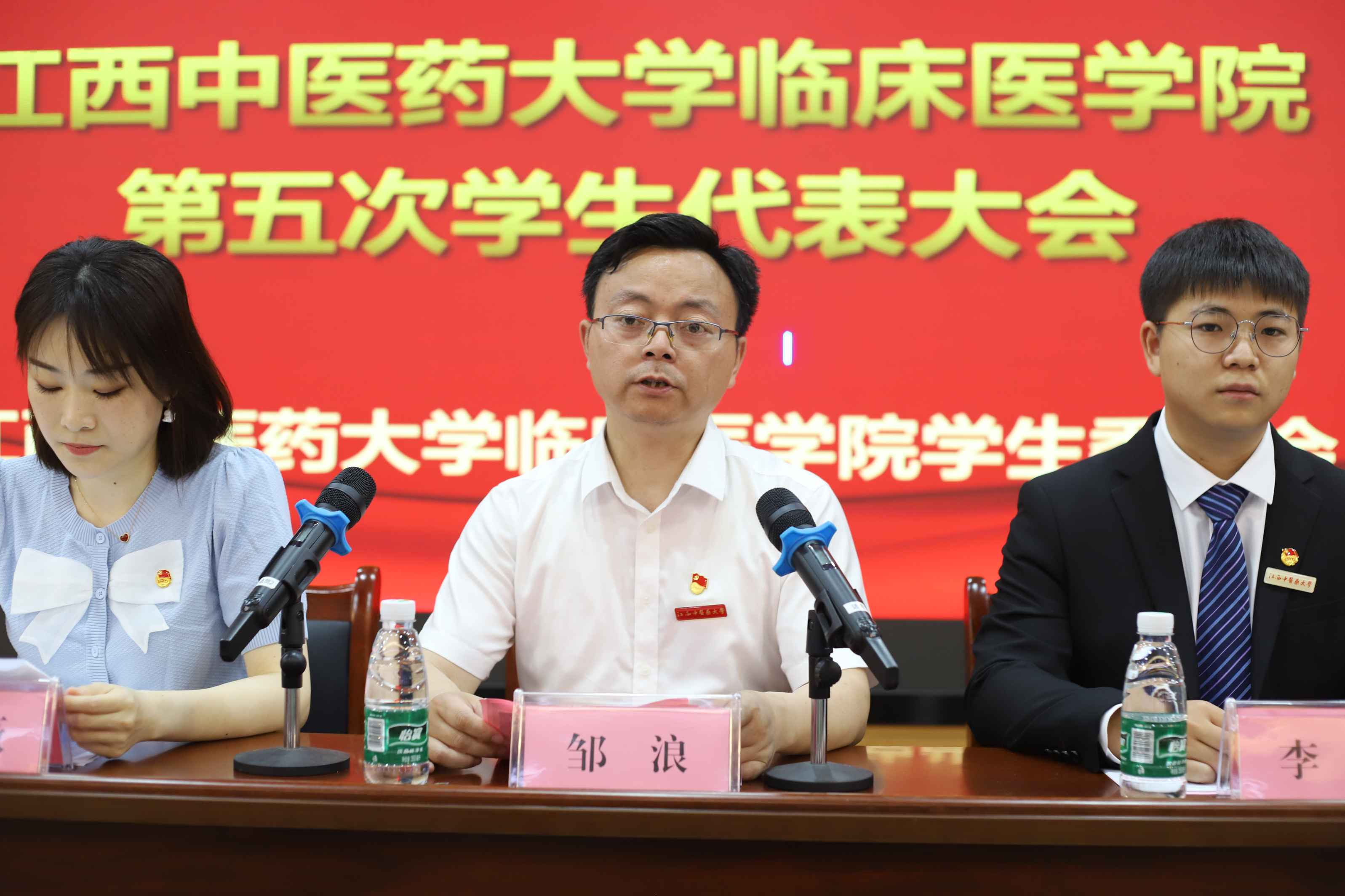 在庄严的国歌声中,临床医学院第五次学生代表大会正式开幕。校学生会代表李铭向大会致贺词,学生会要始终根植在广大青年当中,保持和广大青年的密切联系,引导广大青年成为青年马克思主义者。学院党委副书记、副院长邹浪在开幕式上讲话,对学院学生代表大会的召开表示祝贺,他指出,广大青年要铭记时代责任、把握时代脉搏、勇担时代使命,带领同学们与祖国共奋进、与时代共辉煌,真正发挥先锋模范作用。