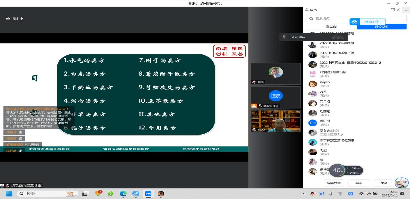 江中新闻网讯(通讯员 陶璐 刘泓岐)为拓展学术视野,营造浓厚的学术氛围。6月11日晚,由教务处主办,临床医学院承办的第七十三期云端中医大讲堂在腾讯会议平台进行线上直播。江西省皮肤病专科金瓶梅电影 中西医结合科主任医师胡凤鸣做客本期讲堂。临床医学院、中医学院、针灸推拿学院、药学院等学院300余名师生在线参与了本次讲座。