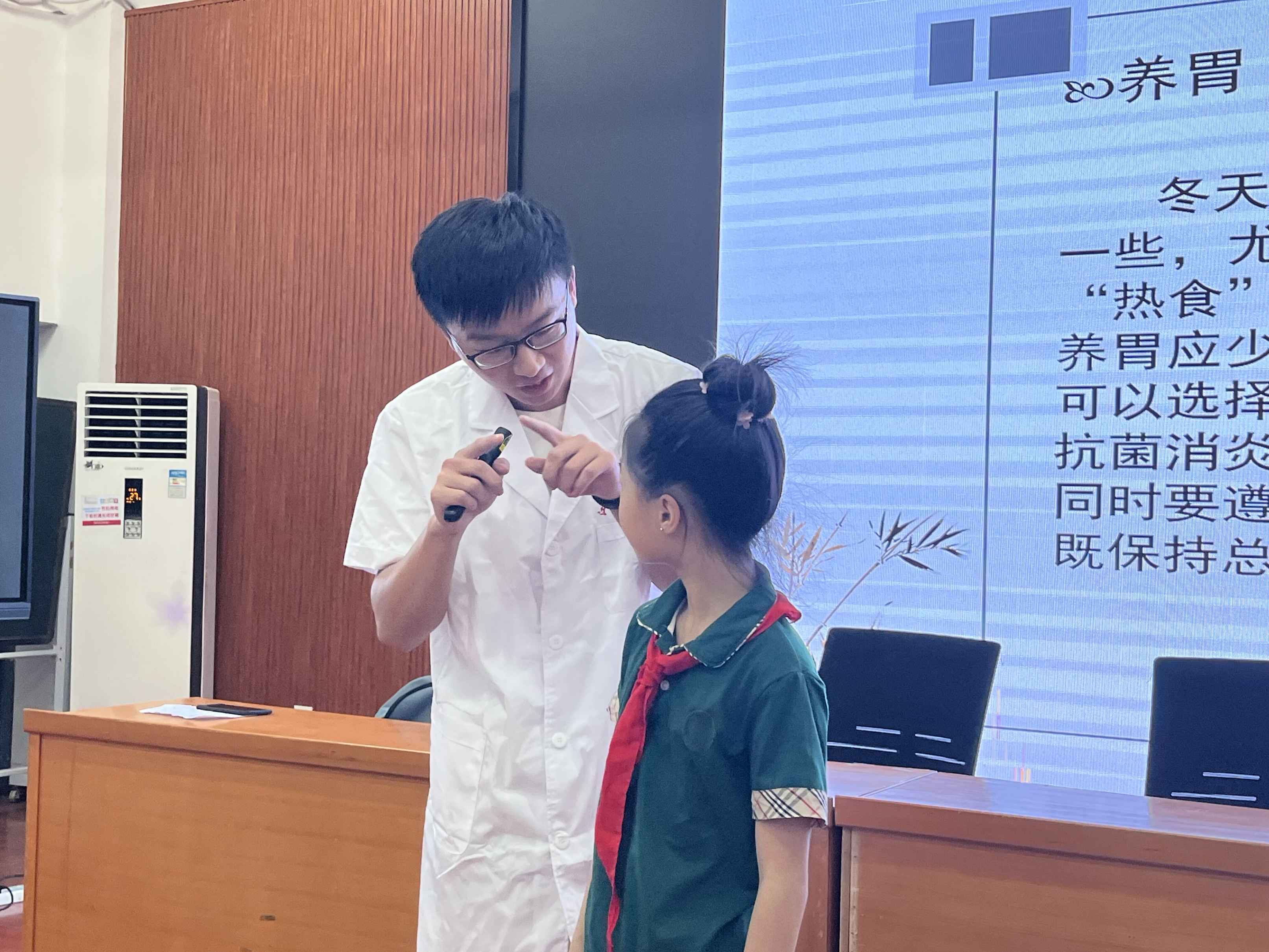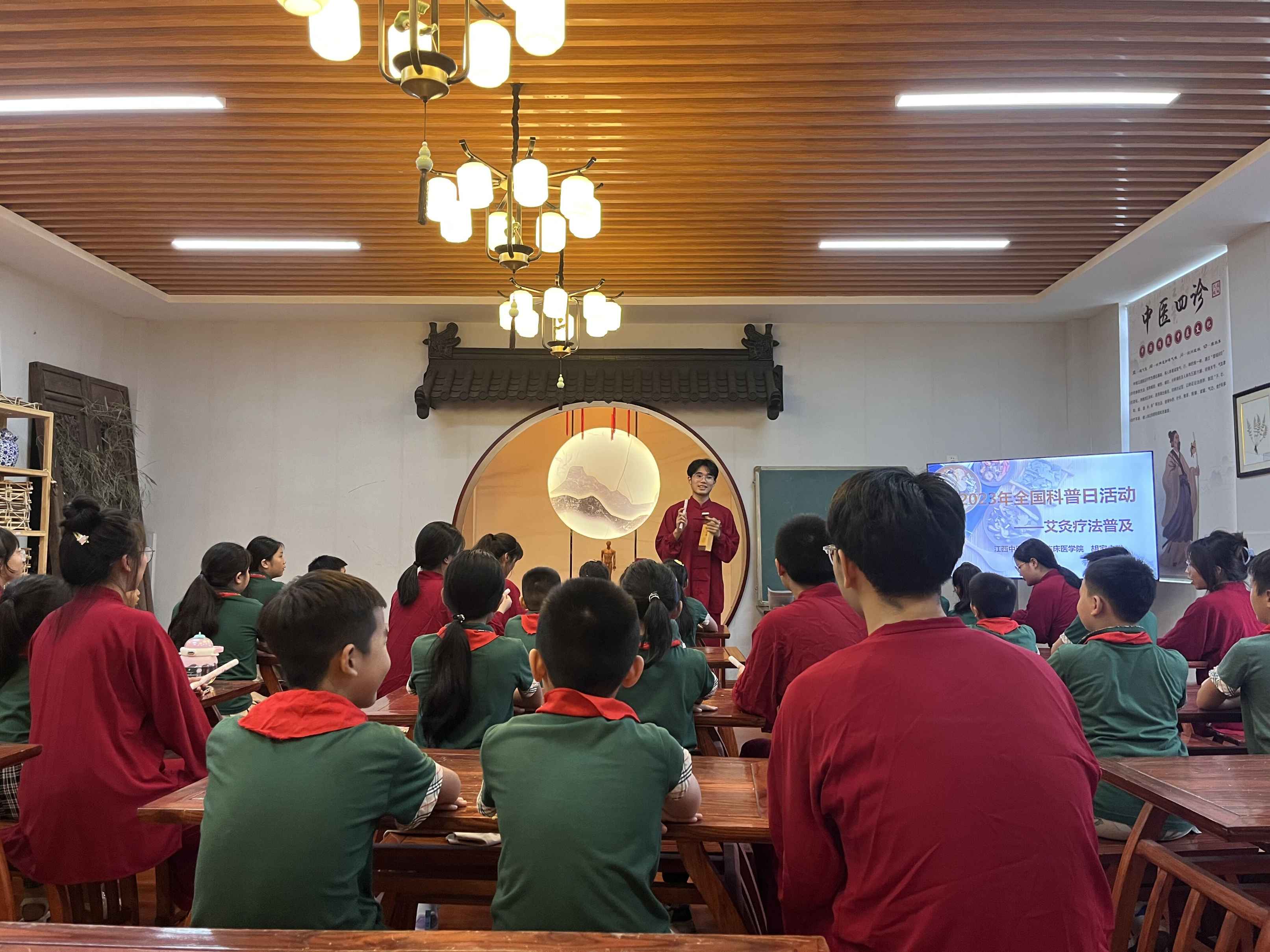 临床医学院学生骨干在胡家小学标本馆内向小朋友们普及艾灸疗法知识并展示艾条的使用,以通俗易懂的话语介绍"一柱着肤疼痛及止,一次施灸沉疴立除"的神奇功效。面对小朋友们提出的诸多问题,学生耐心解答,并带领他们亲身体验艾灸疗法的趣味与奇妙。