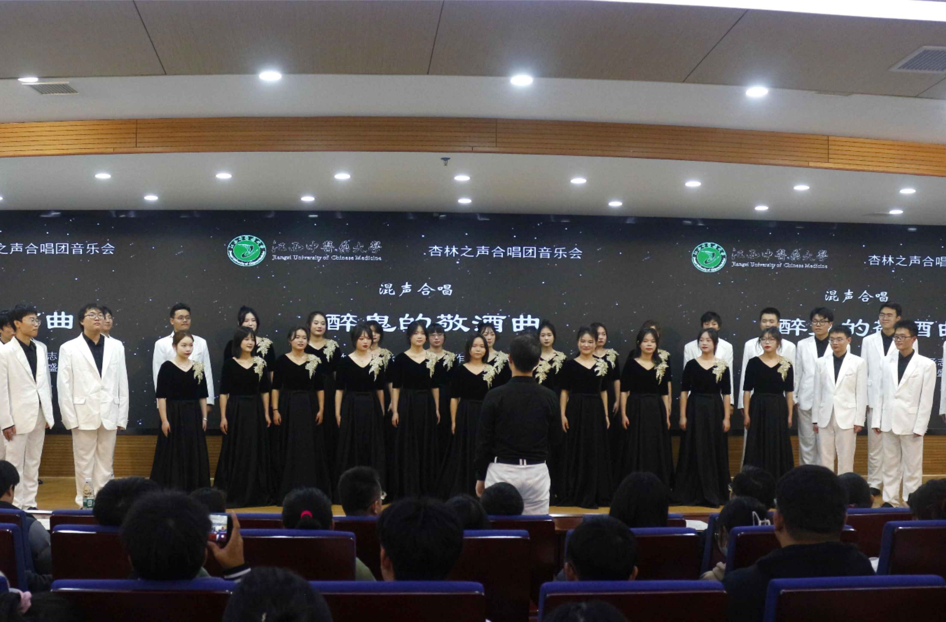 晚上18点30分,精彩绝伦的音乐盛宴正式拉开帷幕。杏林之声合唱团采取器乐演奏、合唱和独唱等形式,为大家献唱十余首娓娓动听、扣人心弦的歌曲。最先唱响的《世界流行中医风》用独具中医特色的歌词迅速将观众带入音乐世界。混声合唱《同一首歌》与钢琴独奏《风居住的街道》紧随其后,两首歌曲回忆卷席,满怀深情,宛转悠扬。紧接着,混声合唱《你笑起来真好看》《越人歌》《醉鬼的敬酒曲》纷纷上演,或生动活泼,或古韵留香,或饱含对生活的热爱,乐声悠扬,传递着无限温情。《是妈妈是女儿》由合唱团成员陈倩、王雅倾情演绎,细腻的歌声、真切的眼神,传递出歌曲中深厚而真挚的亲情。《如愿》温暖而又坚定有力,唱出了当今盛世下青年人向往的信念,愿这盛世,如我们所愿。《道别是一件难事》轻轻唱离别,道出一生最难忘的经历。《启程》高歌梦想,用歌唱祝福同学们新时代新征程有新业绩。