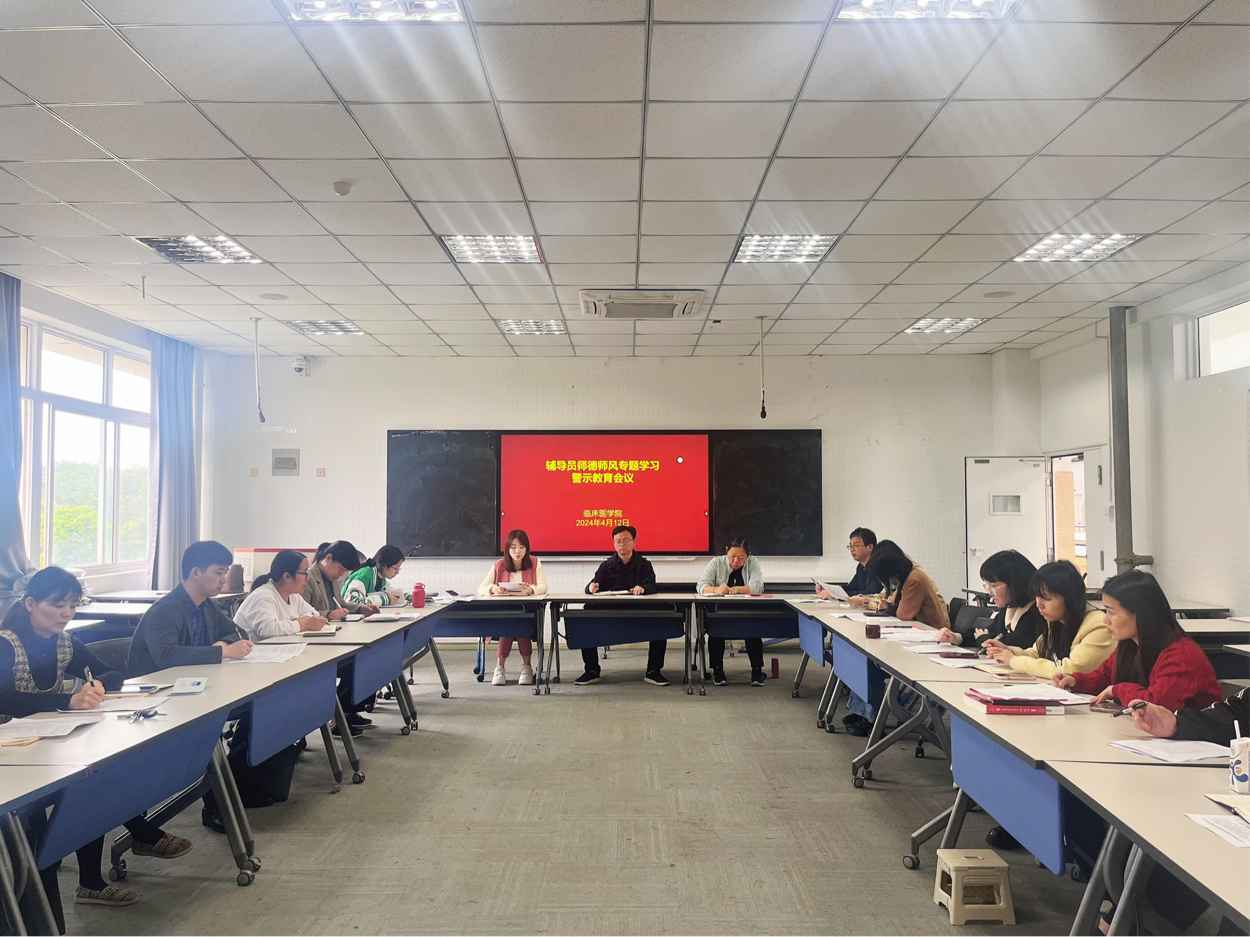 为全面贯彻落实习近平总书记关于教育的重要论述和教师队伍建设的重要指示精神,强化师德师风第一标准,推动师德师风建设常态化长效化,4月12日,临床医学院于立德楼1405教室组织全院辅导员召开师德师风专题学习和警示教育会议。