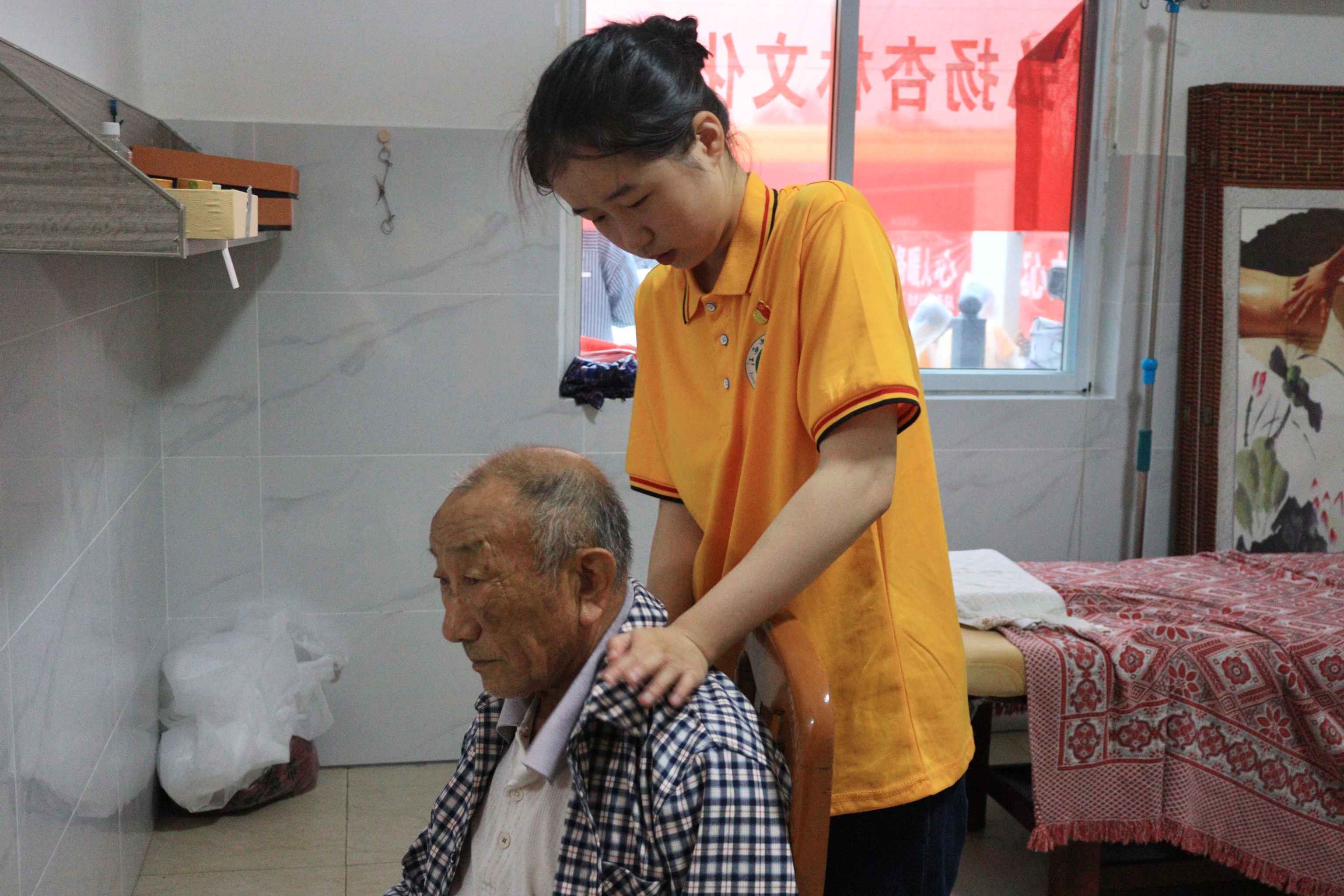 “一柱着肤疼痛即止,一次施灸沉疴立除。”义诊团队同时也为当地村民提供推拿、艾灸和刮痧等中医特色疗法服务。“您之前体验过艾灸疗法吗?”志愿者们在村民“足三里”“丰隆穴”“血海穴”等穴位上方点燃艾条。艾灸一上一下,一缕轻烟随之升腾,淡淡的药香弥漫开来,温热也一阵一阵,如潮水一般,起落有秩。“大爷,这个力道您觉得舒服吗?”推、拿、按、摩、揉、捏、点、拍,志愿者们运用娴熟的手法推拿,动作轻盈有力,帮助村民疏通经络、推行气血、缓解酸痛。“按摩一下腰背的酸痛感果然立马好转了不少。”按摩后,村民身上的疲倦感消减了不少,他们脸上都露出了舒心的笑容。