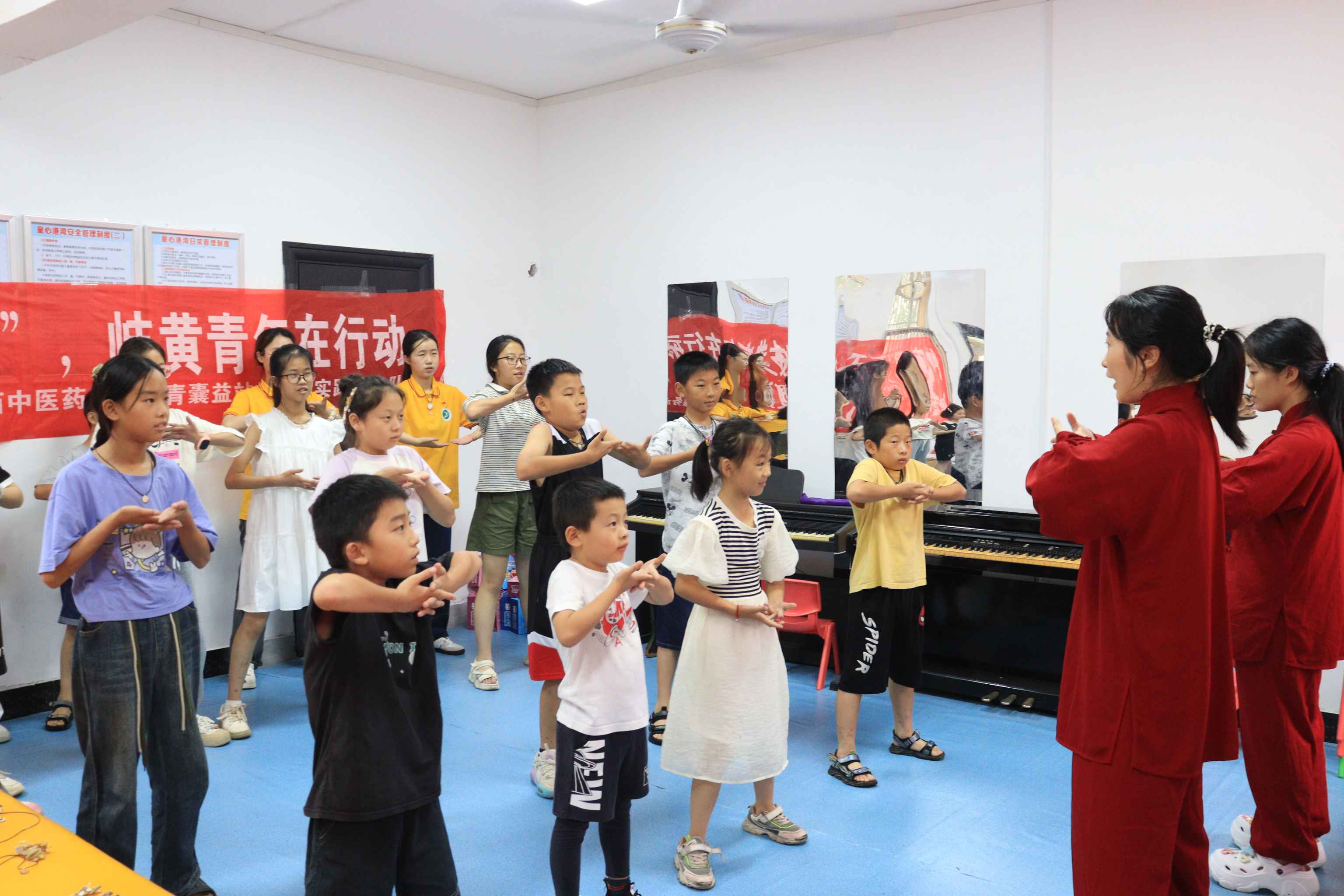 在泽泉乡朝阳社区,团队功法队成员正在为小朋友们进行传统功法八段锦教学。“左手托天理三焦,调理脾胃需单举……”在和谐的伴乐中,功法队员通过通俗易懂的语言以及刚柔兼济、行云流水的动作示范,一边演示一边讲解“八段锦”的功效和练习技巧,指导孩子们对照模仿学习。孩子们跟着队员们的示范讲解节奏开步屈膝、仰头翻掌、两手攀足……在一招一式中感受中医文化的深厚魅力。