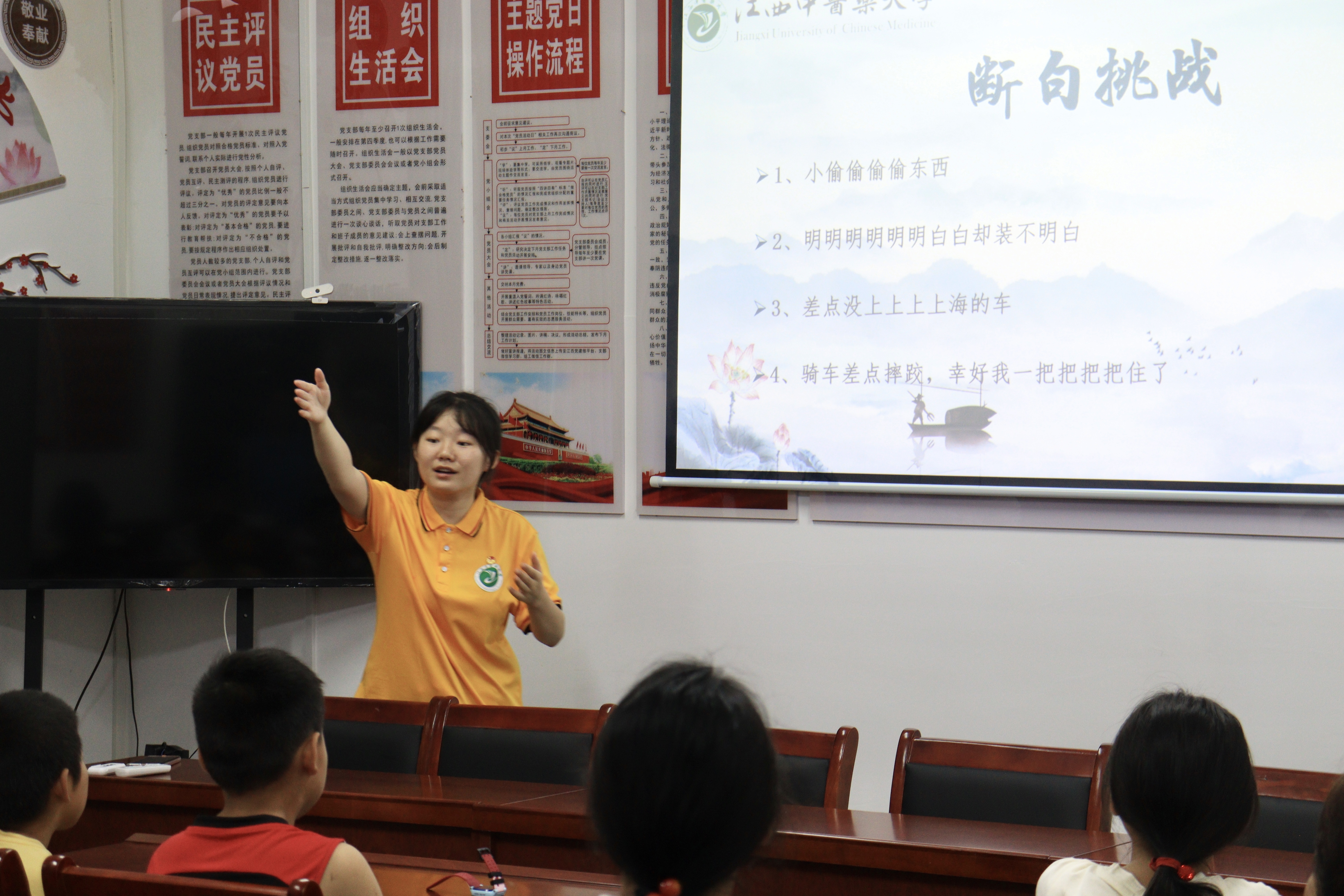 “四是四,十是十,十四是十四,四十是四十……”在泽泉乡朝阳社区党群活动中心二楼会议室内,实践队员们向村民和孩子们开展“普语传千里,语通心相连”推广普通话宣讲活动。实践队队员们从“普通话的定义和历史”“普通话与方言的关系”和“普通话的作用与意义”三个方面深入浅出地向村民和孩子们科普讲好普通话的重要性。随后,队员们开展“断字挑战”“绕口令挑战”和“朗诵挑战”等趣味游戏,用轻松快乐的方式,引导村民和孩子们重视普通话的运用,在他们心中播下对语言文字的热爱之种。