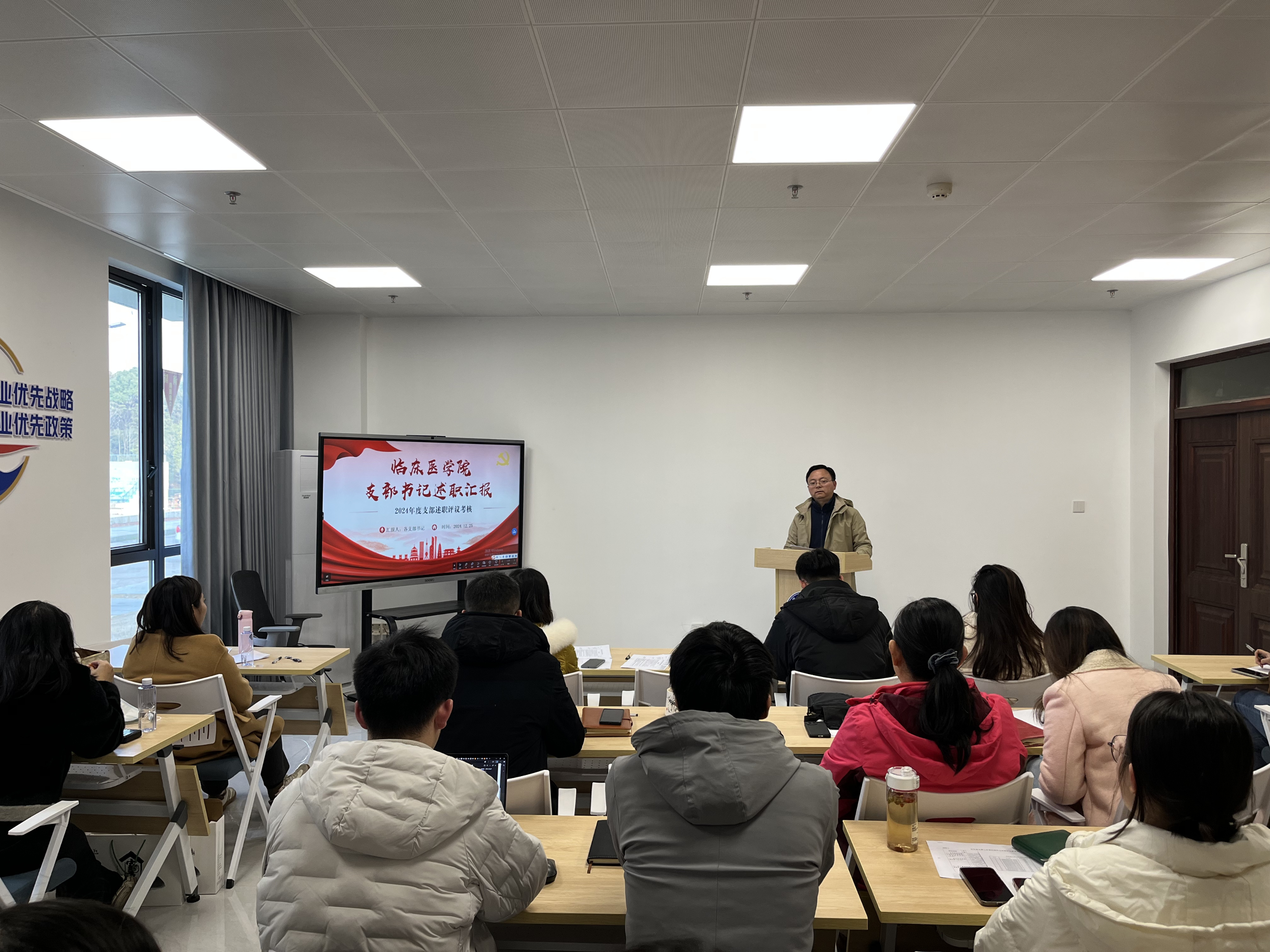 为进一步强化学院基层党建工作,全面夯实基层党组织的政治能力与组织能力,提升基层党支部工作标准化、规范化、信息化水平,全面、公正、客观考核各学生党支部工作成效,12月25日下午,临床医学院召开2024年度学生党支部工作考核和学生党支部书记述职评议考核工作,上级党组织考核小组、党员群众代表以及学生党支部书记参加了本次评议,学院12个学生党支部进行了述职。