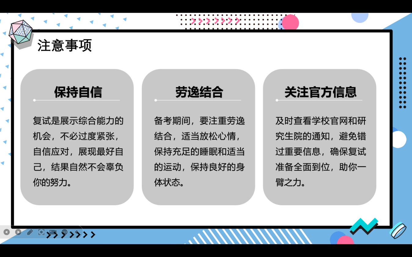 此次分享会为即将参加研究生复试的同学们提供了宝贵的经验和实用的技巧。同学们纷纷表示,对考研复试有了更加清晰的认识,并掌握了许多实用的备考技巧。相信在学院的支持和学长学姐的助力下,考研学子定能披荆斩棘,顺利上岸,实现梦想。