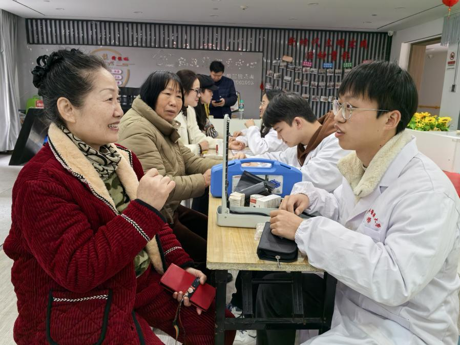 义诊现场,学生党员们为中老年群体测量血糖、血压并仔细记录。针对指标异常的居民,学生党员们会提供科学的健康指导和就医建议,并告知相关注意事项。此外,他们还为社区居民提供了中医推拿、按摩和艾灸等保健治疗服务,帮助居民放松身心,缓解疲劳。