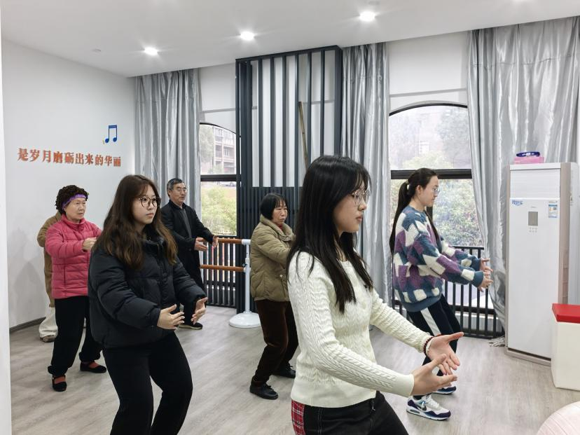 随后,学生党员们带领居民练习中医传统功法,并向居民普及八段锦等中国传统健身功法在养生方面的作用与优势,手把手教授居民们一些简单的功法动作。