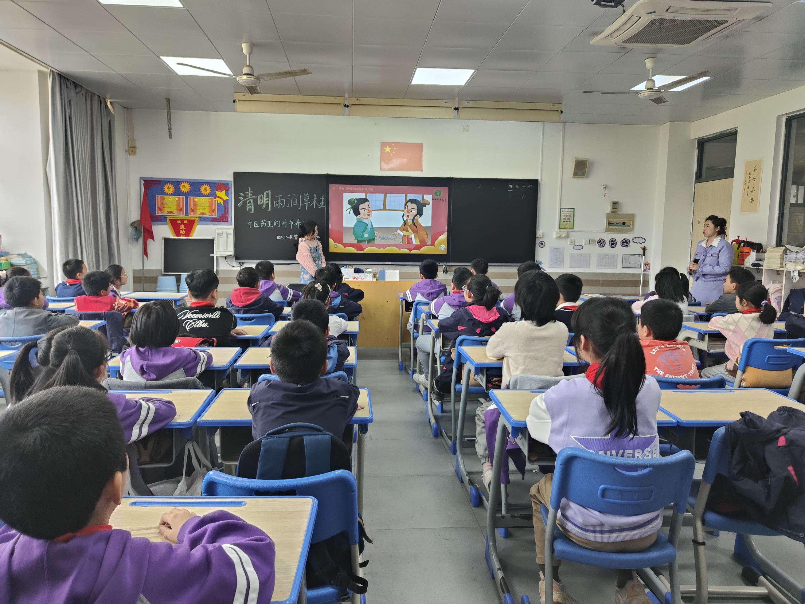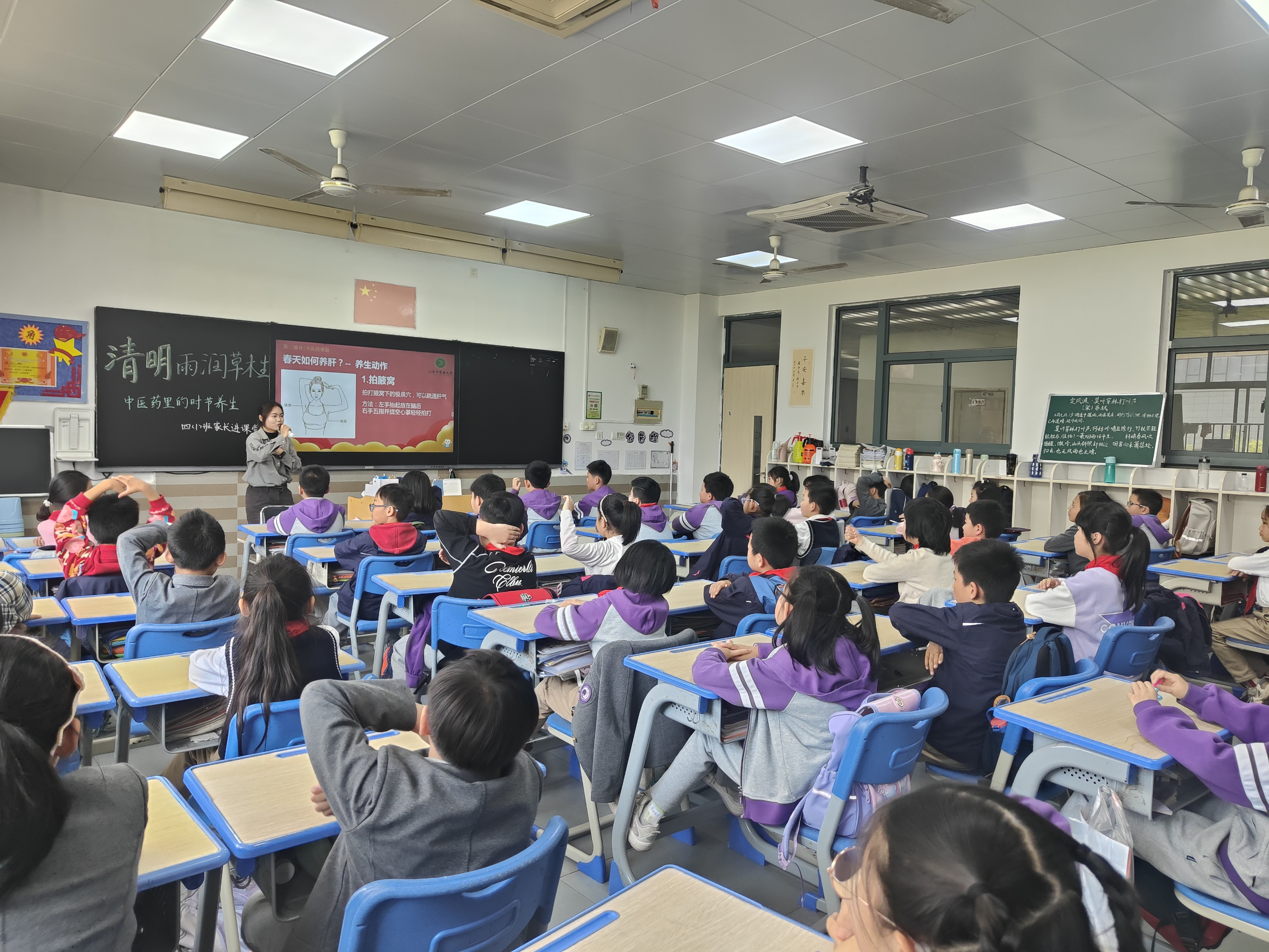 上课铃响,主持人用一个视频开场,简要地向小朋友们介绍了清明节的由来,并提出问题“清明节的习俗哪些?”小朋友们争相举手,踊跃地回答。随后,主持人切入本次宣讲主题“清明节时节的养生智慧”,告诉小朋友们春天需要养肝。主持人用肢体动作和充满童趣的图片,讲解了肝的具体位置,将肝形象地比喻为身体的“交通指挥官”,让小朋友们对“肝主条达”、“肝主运化”等中医理念有更深入的了解。