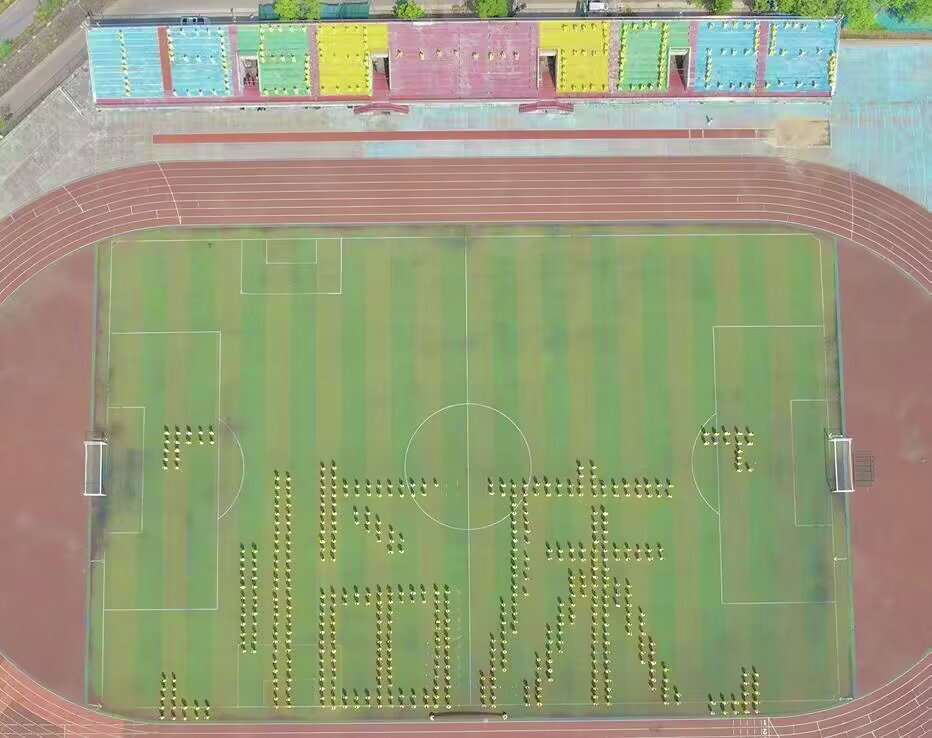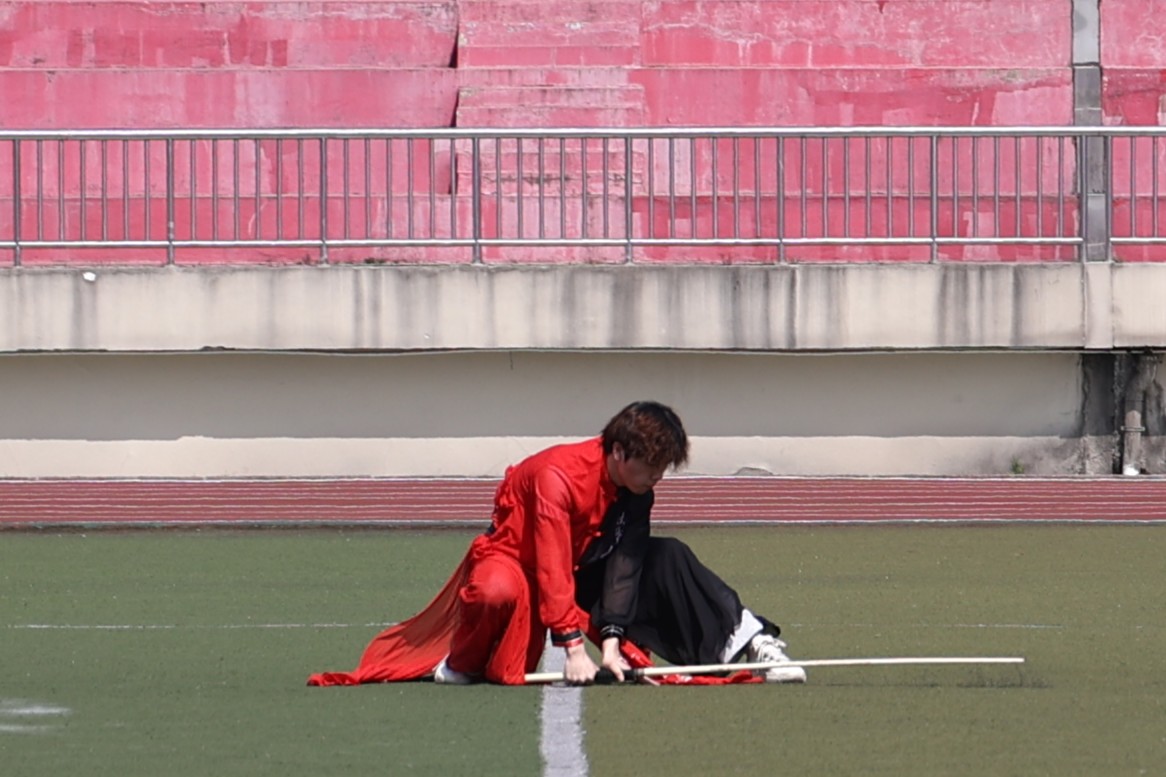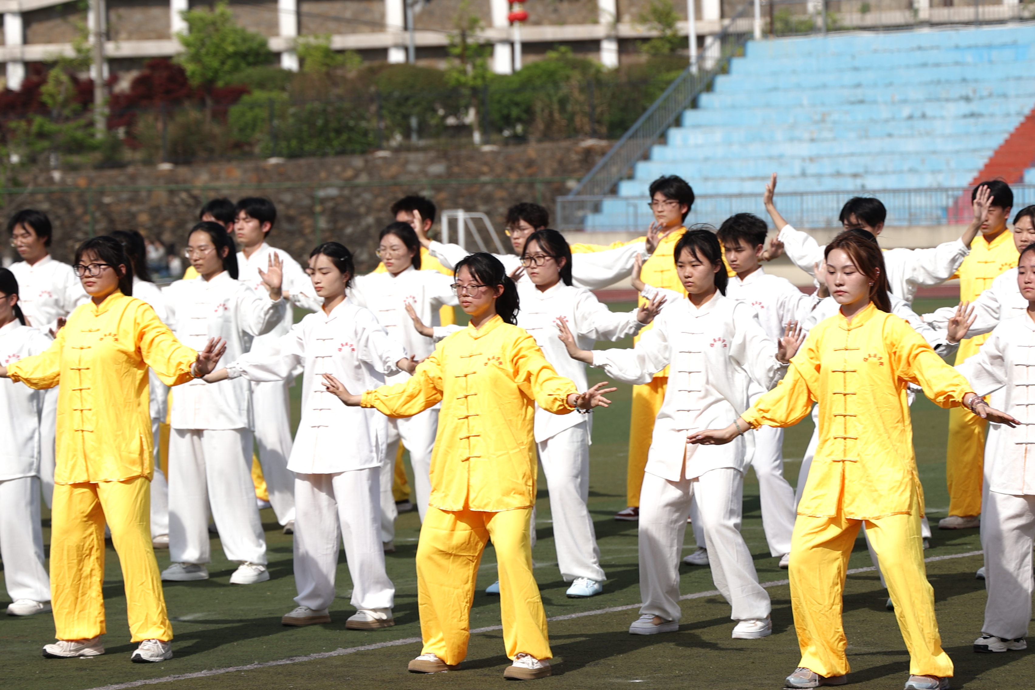 随后,千名身着黄色太极服的临床学子们迈着整齐的步伐登场,变化着队形,为大家带来“太极印象”表演。操场上,素黄的“临床”二字铁画银钩、遒劲有力,尽显青年学子的锋芒。瞻远台上,“1959—2025”在阳光下熠熠生辉,明丽耀眼,彰显江中的蜕变。起、降、抱、棚……临床学子行云流水的动作将太极柔和缓慢的特点展现得淋漓尽致。江西中医药大学武术协会紧随其后,为同学们献上表演《武动乾坤》。武术协会成员毫不拖沓,拳势气贯长虹,棍势刚柔并济,刀势锐不可当,将武术魅力尽数呈现。表演结束,裁判代表和学生代表庄严宣誓,比赛正式开始。