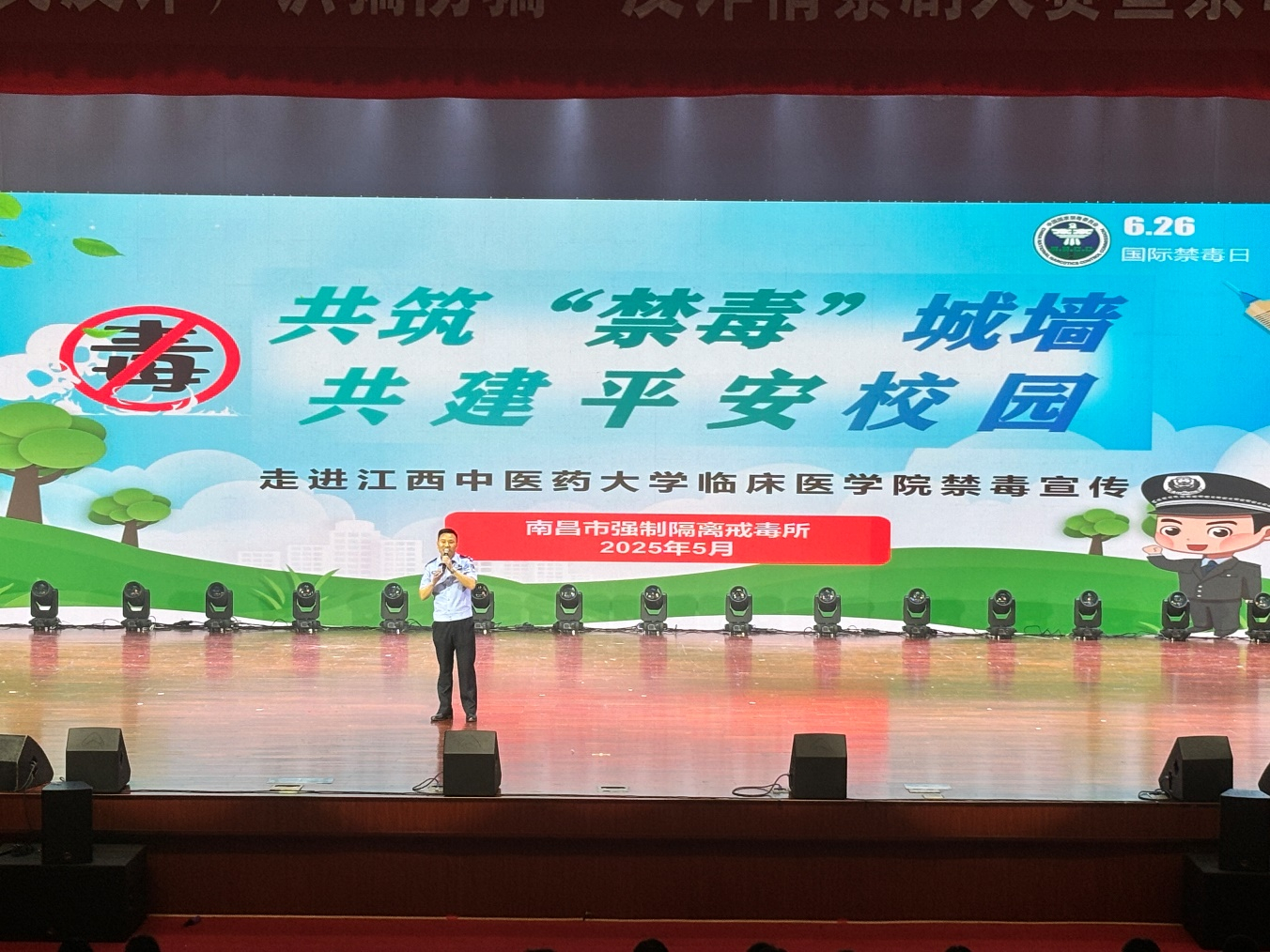 禁毒知识专题讲座环节,南昌市强制隔离戒毒所刘增仁警官结合真实案例与数据,深入剖析毒品危害,重点讲解新型毒品伪装形式及防范技巧,强化学生识毒拒毒能力。