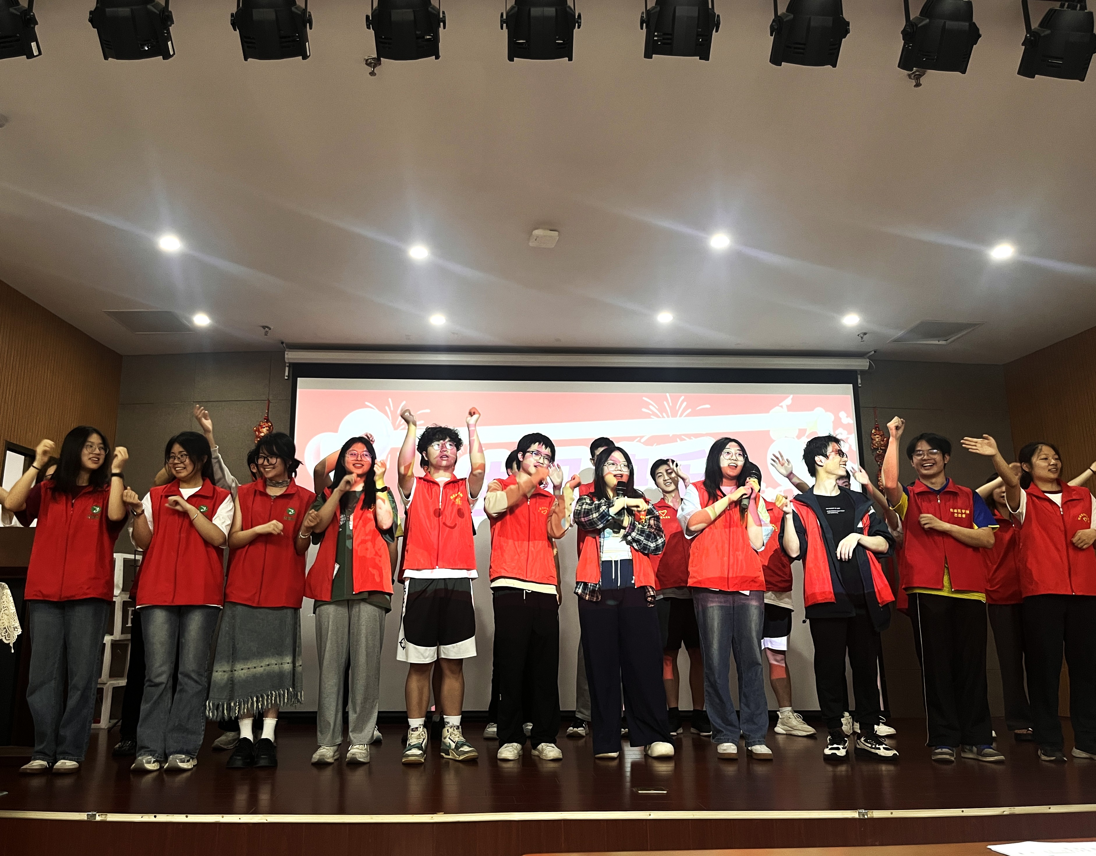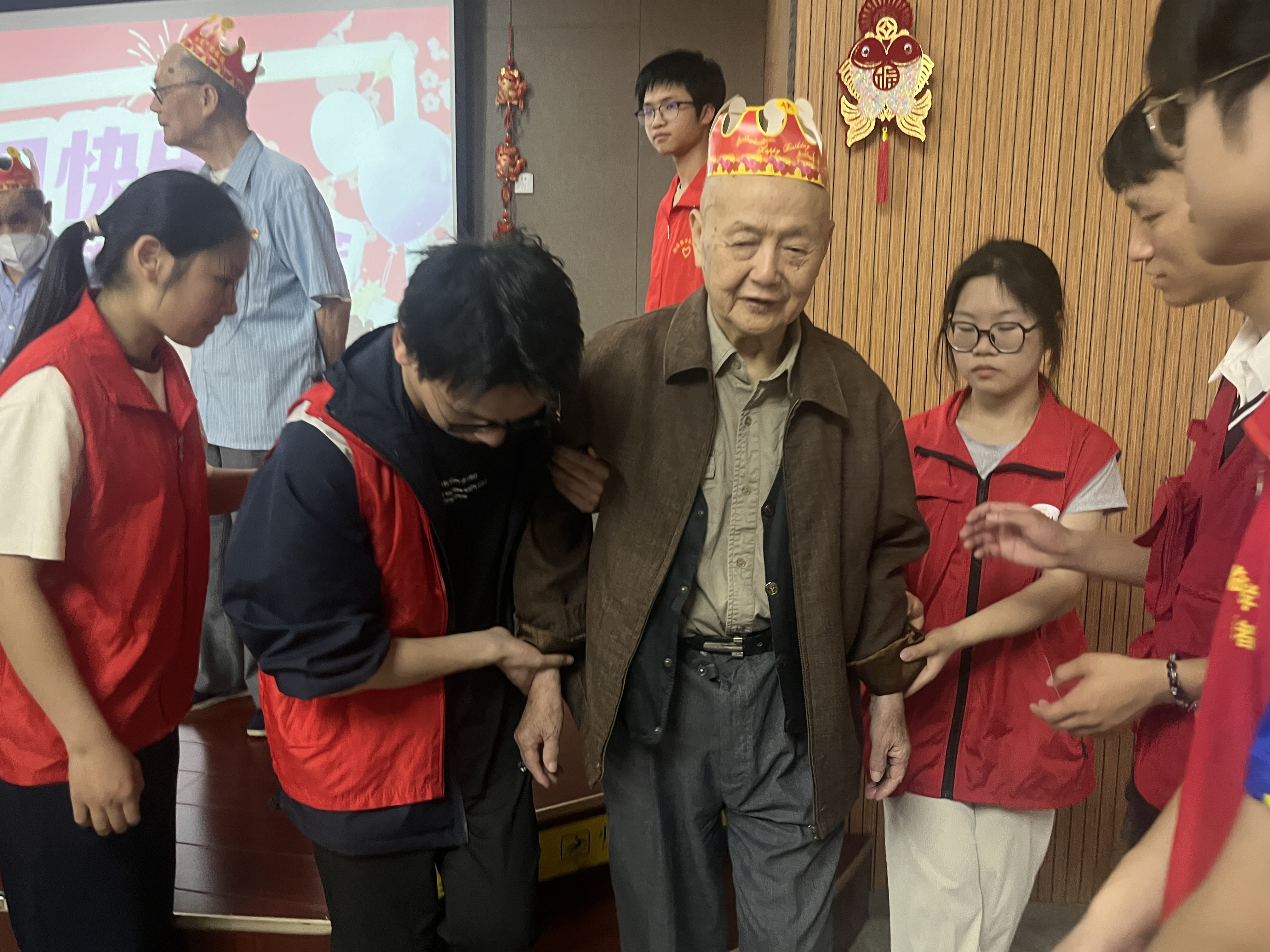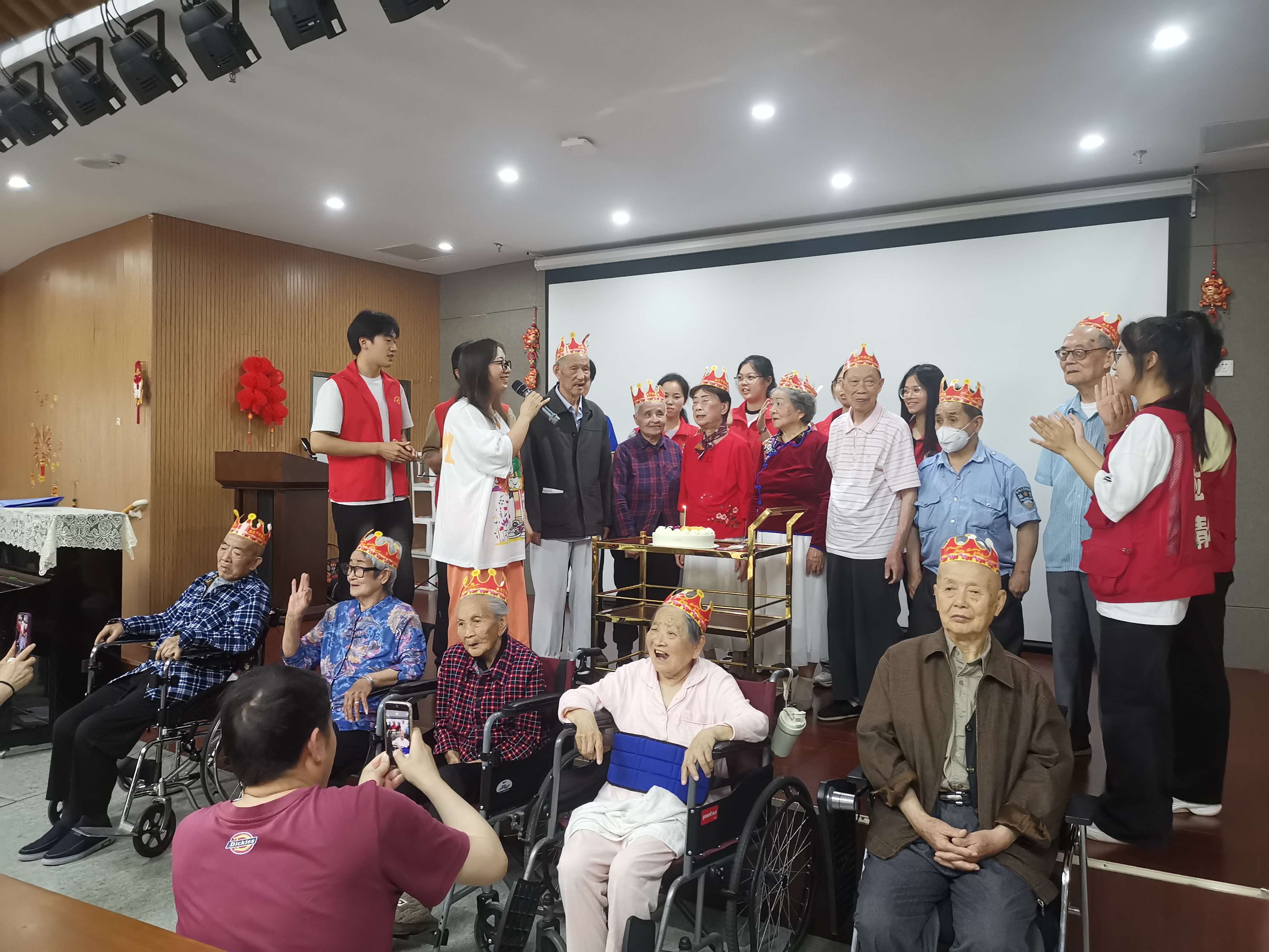 活动伊始,学生党员和入党积极分子分组来到老年人们的住处,询问他们的身体情况,并邀请他们前往活动中心参加“五月长者集体生日会”。一路上,志愿者们小心搀扶着行动不便的老人,耐心与老人沟通,倾听他们的需求,陪同他们入座。生日会上,学生党员志愿者们伴随着悠扬的音乐,用饱满的情感和动人的嗓音,带来合唱歌曲《我们都是追梦人》,为老人们集体庆生。志愿者们青春洋溢的笑容和歌声感染着现场的老人们,赢得了热烈的掌声。