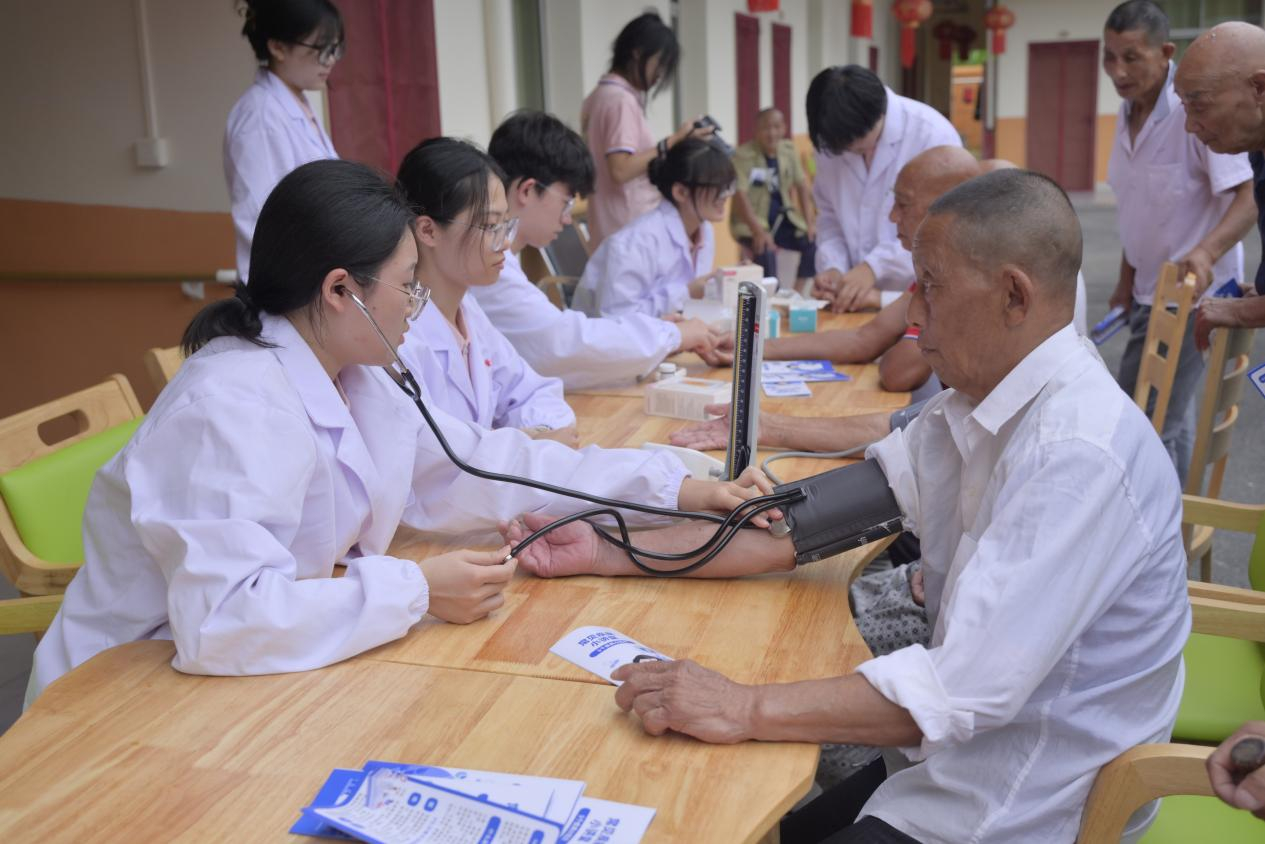 清晨的阳光洒进敬老院院落,队员们早已忙碌起来。义诊区内,实践队的同学们正在为老人们进行系统的健康检查。血压测量区,队员们半蹲着身子,细心为每位老人调整袖带;血糖检测点,同学们熟练地操作仪器,还不忘叮嘱注意事项。"爷爷,您的血糖值在正常范围内,但平时还是要少吃甜食哦。"2024级中医学黄同学温柔地嘱咐道。 在中医药体验区,一场别开生面的香囊制作活动正在进行。队员们提前准备了艾叶、香茅、桂枝等16种中药材,按照驱蚊、安神、提神、疏肝解郁四种功效精心配伍。"这是艾叶,有温经止血的作用;这是香茅,可以驱蚊避虫..."2023级针灸推拿学专业的罗同学一边讲解,一边手把手教老人们装填香囊。86岁的樊爷爷捧着刚做好的安神香囊,笑得合不拢嘴:"这些孩子真贴心,做的香囊又好看又实用!"