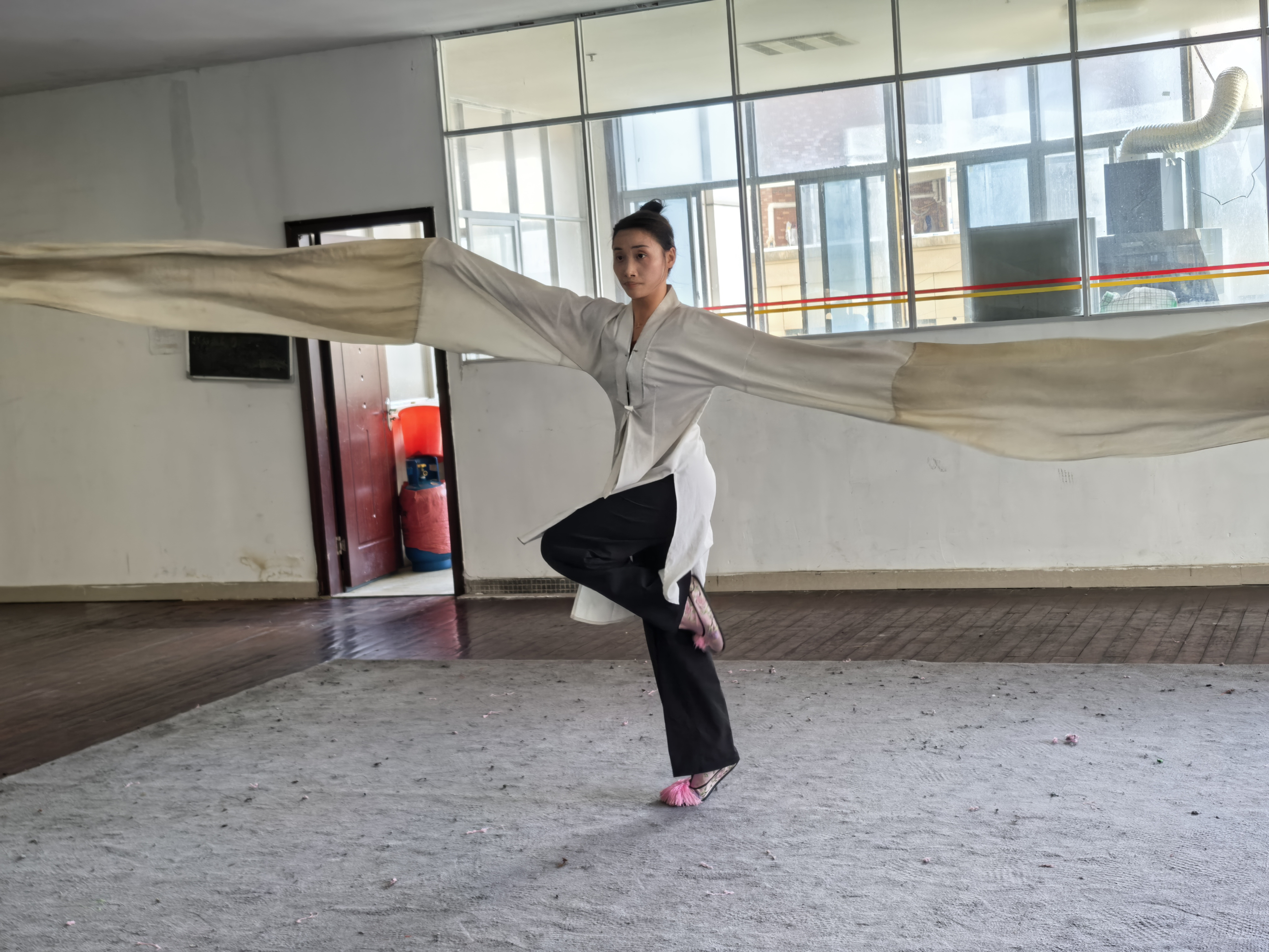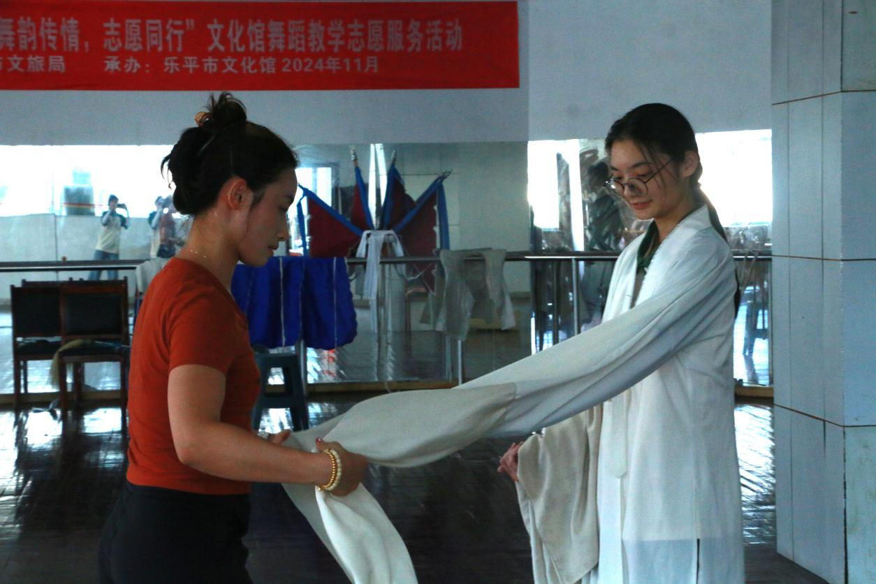 “抖,掷,挥,翻,扬,甩……”水袖灵动飘逸,似袅袅升腾的云雾,似涌动的波涛,伴随着演员的舞姿,在空中流淌翻腾。实践队员身着练功服,在赣剧团演员手把手的指导下,学习扬袖和基础的赣剧表演动作。队员们跟随老师的动作,双手似拈花,从眉梢间拂过,眼神缓缓抬起,眼波流转,少女欲说还休的形象跃然眼前。