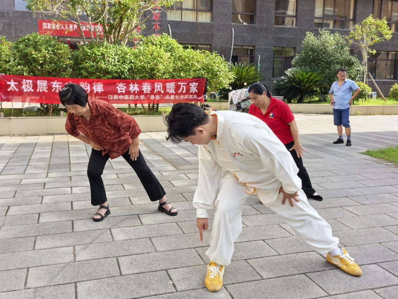 “奶奶,这个动作的手势是这样的。”在长天松康乐平颐养中心和洎阳街道天湖社区户外空地上,实践队员们手把手地教导居民们学习传统功法八段锦和太极拳。“左右弯弓似射雕,这个动作是模仿拉弓的动作,所以双手需要张开。”实践队员们细致地为居民们讲解每个动作的要点,逐一进行示范。在悠扬的音乐中,实践队员与居民们共同感受传统功法的韵律与力量。