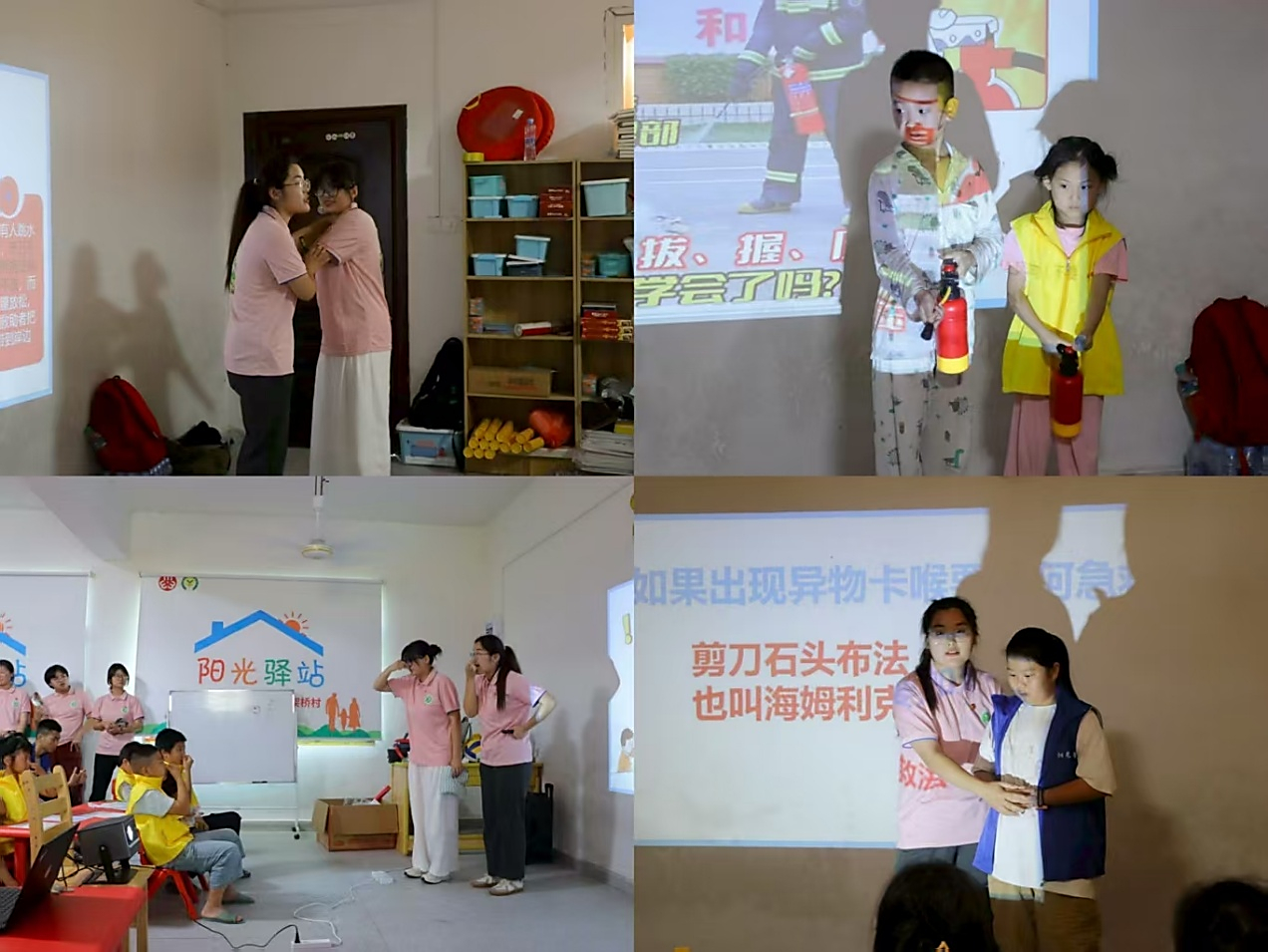 实践队精心设计“安全小卫士闯关”教学。防溺水板块:通过动画展示危险水域,引导思考风险。面对提问,孩子们踊跃指出水库游泳隐患。队员随即示范落水自救“仰头漂水、甩掉重物”要领,强调求救原则。急救知识环节:专业纠正流鼻血处理误区,邀请演示正确步骤;烫伤教学简化为“冲、脱、泡、盖、送”五字诀;海姆立克急救法针对异物卡喉,现场演示并讲解“剪刀(定位脐上)、石头(握拳顶住)、布(包拳冲击)”口诀,强调要点及呼救,部分孩子模拟练习掌握技能。消防安全板块:揭示常见隐患,演示灭火器“看、提、拔、握、压”五步法,孩子们热情模仿。青年学子以专业、耐心和生动演示,为孩子们撑起多维安全“保护伞”,让安全种子深植童心。