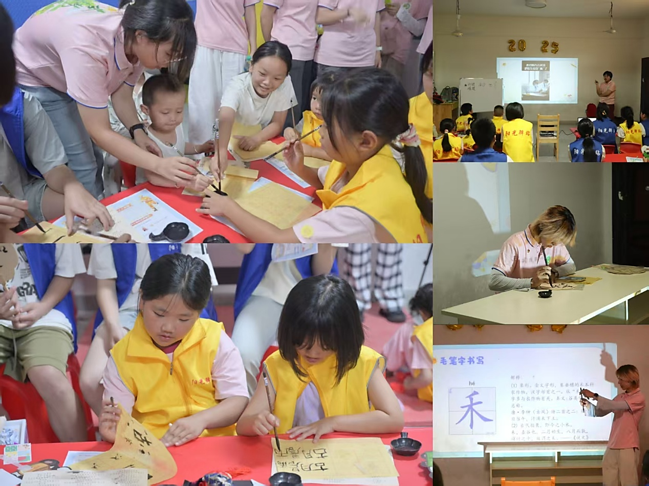 紧扣主题,实践队构筑语言文化之桥,融合“说、读、写”并嵌入书法文化。笔墨传韵:组织规范书写,队员们执笔示范,讲解基础笔法,引导孩子们在书写中体验汉字筋骨韵味,理解其修身养性、传承文明的意义。字正腔圆:“中药读音小课堂”结合字形理解,借助短视频纠正“白术”、“川芎”等发音,讲述文化渊源;“红色经典诵读会”上,孩子们挺直腰板,用标准、饱含情感的普通话铿锵朗诵,在诵读中提升能力,传承红色基因。青年队员们以规范书写筑基、准确发音正言、深情诵读传情,有效提升儿童语言素养,深植文化自信,架起通向未来的文化桥梁。