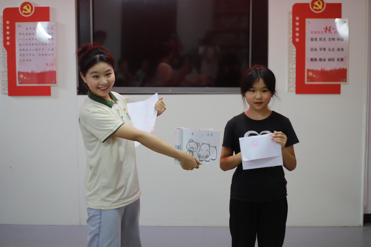 在一场场以“排解心绪,拥抱晴空”“呵护心灵,学会沟通”为主题的团辅中,孩子们通过姓名接龙、爱好分享与“动作桥梁”游戏迅速拉近距离,方言与夸张动作交织出欢声笑语。接着,记忆挑战环节激发了他们的专注力,“画语传情”则让想象力与表达力在互动中尽情绽放。随后的“驿站传书”通过肢体语言、手势或表情等无声方式传递方言词汇,在静默中展现语言的独特魅力。