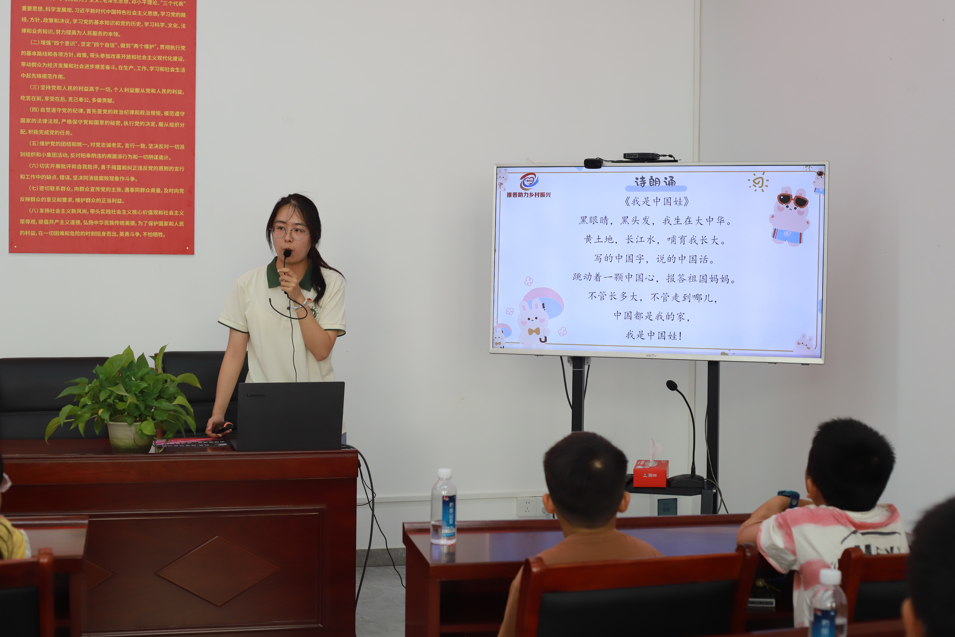 宣讲员通过结合日常生活中“女红”“模样”等例子,纠正了容易出现错误的发音。接着,孩子们进行了配音、萝卜蹲等互动游戏,在轻松的氛围中学习并掌握正确的发音方式。“黑眼睛,黑头发,我生在大中华。”一首深情的诗朗诵激发孩子们的爱国情怀与文化自信。孩子们齐声诵读,声音洪亮,情感真挚。这一刻,他们不仅是在朗诵一首诗,更是在表达对中华文化的认同与热爱。