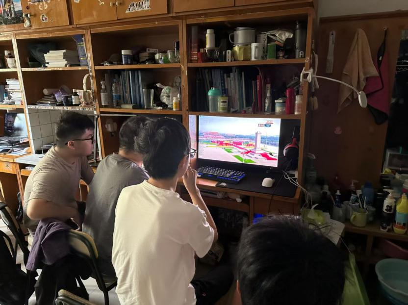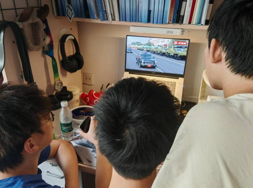 当阅兵仪式正式开始,铿锵有力的步伐声回荡在教室中,同学们全神贯注,目光紧随屏幕。受阅部队整齐划一的队列、现代化武器装备的集中展示、空中梯队呼啸而过的雄姿,不断引发阵阵赞叹和热烈的掌声。许多同学情不自禁地用手机记录下震撼瞬间,通过社交媒体表达对祖国强盛的由衷自豪。