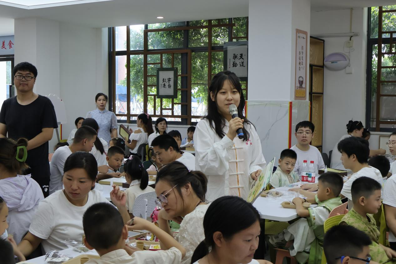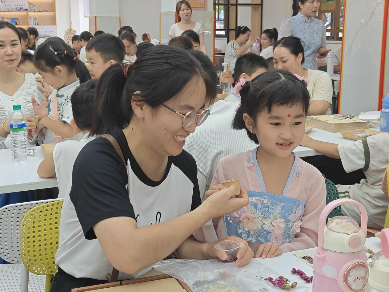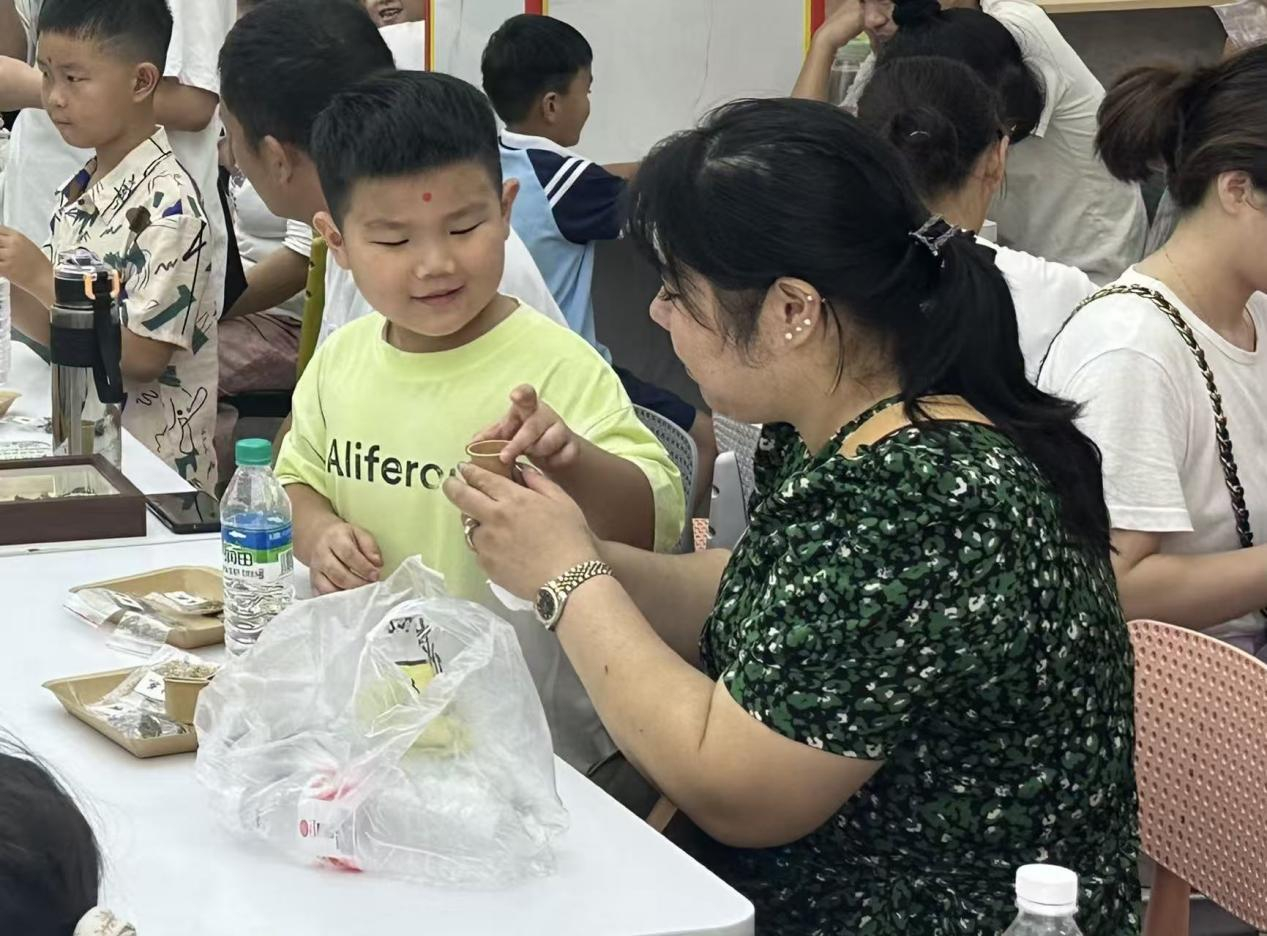 在“制茶奉礼”环节中,孩子们学习了传统奉茶礼仪,运用刚学的四种中药为家长冲泡“四季解暑茶”。跟着宣讲团同学的示范,他们双手捧杯,鞠躬行礼,向家长表达感恩之情。不少家长接过茶时感动不已,和孩子拥抱、回礼,现场温情洋溢。