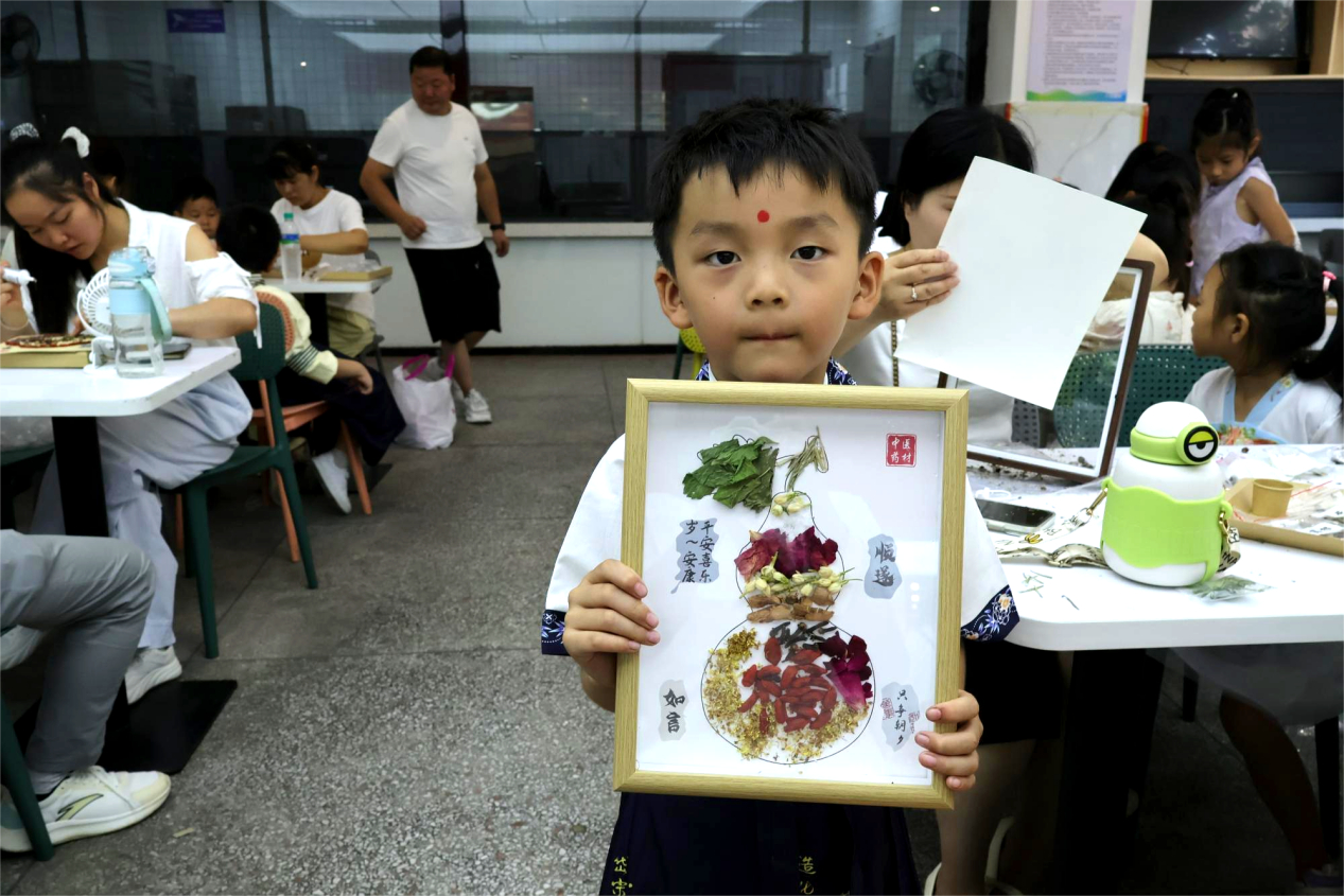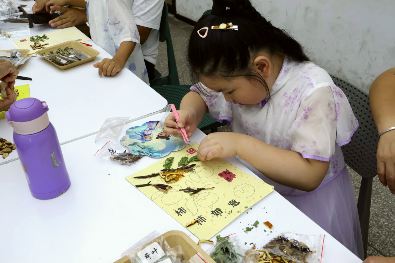 奉茶仪式后,在家长的陪伴下,孩子们利用中草药标本,共同完成了中草药贴画的创作。这一幅幅洋溢着童趣与想象力的作品,为一年级新生的小学生涯留下了第一份充满药香的美好纪念,也在亲手实践中,加深了他们对中草药文化的了解与热爱。