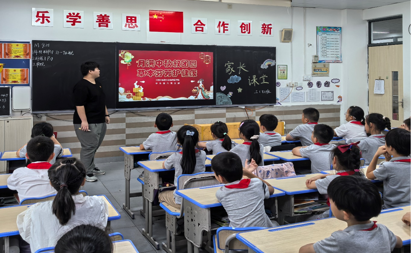 为宣传优秀传统节日文化,传承中医药文化,9月25日,临床医学院学生第六党支部前往红谷滩区凤凰城上海外国语学校,开展了一场以“中秋叙团圆,本草护健康”为主题的教育活动。此次活动通过趣味十足的形式展开,旨在让孩子们了解中秋节常见的桂花、菊花等草本植物的药用价值,减少对中医药的陌生感。同时,借中秋“健康团圆”的寓意,向孩子们普及简单的中医药健康知识,引导他们在生活中关注健康。