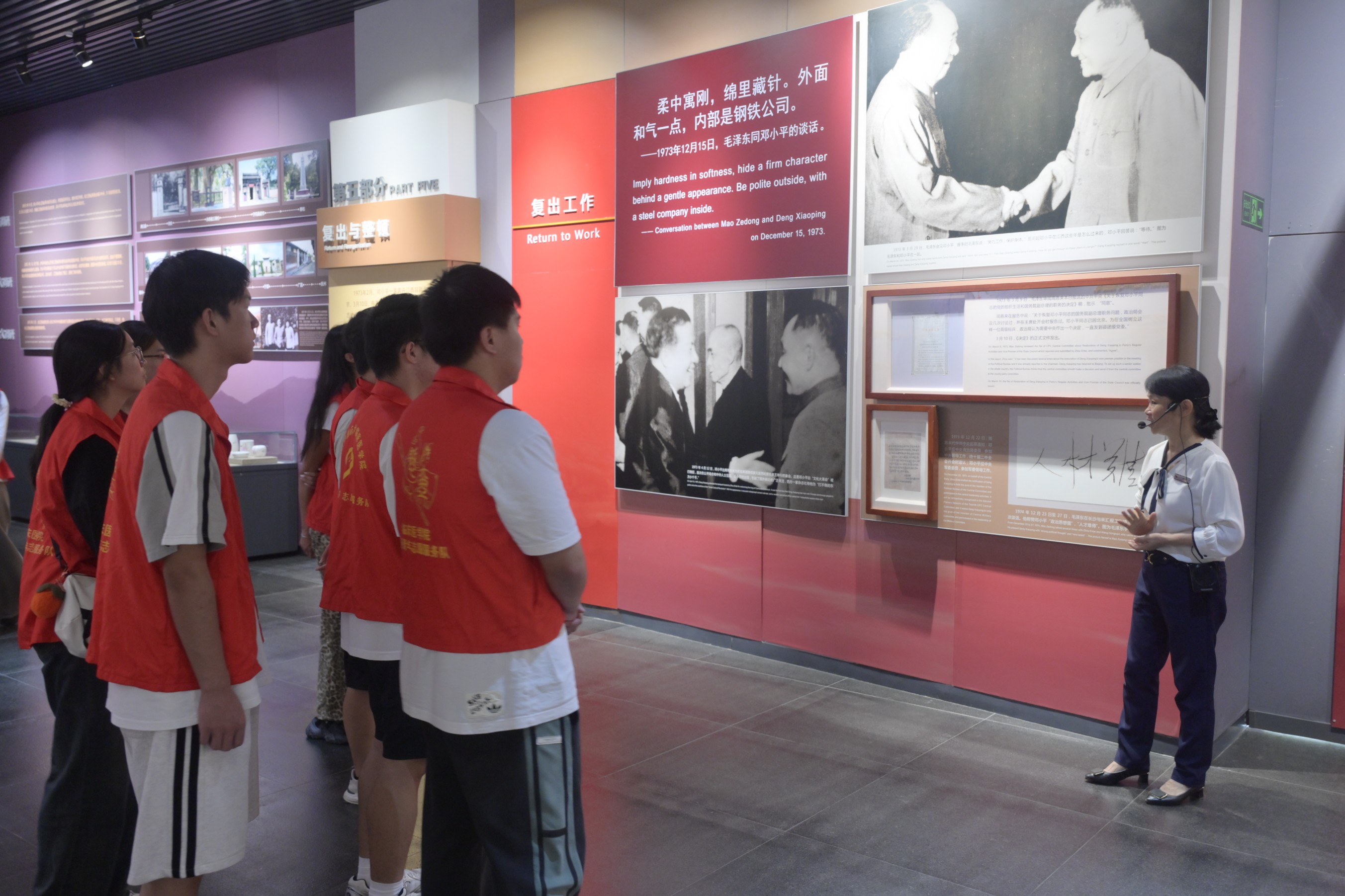抵达后,学生代表们怀着崇敬之心步入陈列馆。随着讲解员声情并茂的讲解,一段段壮烈史诗、一幅幅历史画面徐徐铺展,大家仿佛穿越时空,见证了邓小平同志在逆境中的从容与坚韧。邓小平同志严于律己、百折不挠的风骨,深深叩击着每一位青年的心。