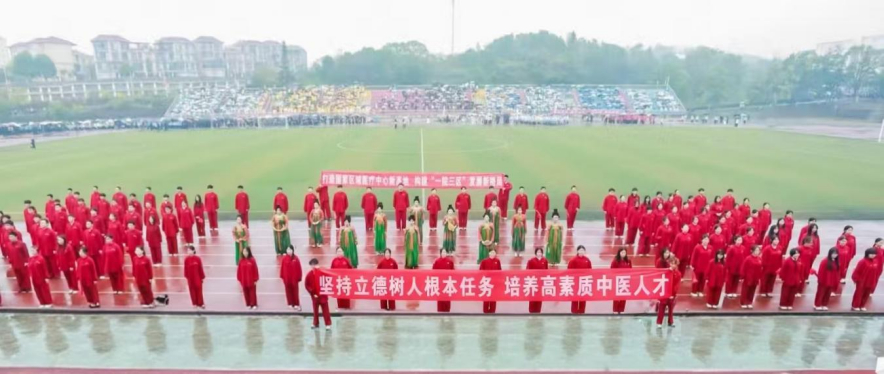 音乐渐停,“坚持立德树人根本任务,培养高素质中医人才”、“打造国家区域医疗中心新高地,构建‘一院三区’发展新格局”横幅被同学们高高举起,师生共同高喊“附属临院,铸就辉煌”。嘹亮的口号响彻赛场,体现了学院师生奋进拼搏的饱满热情。