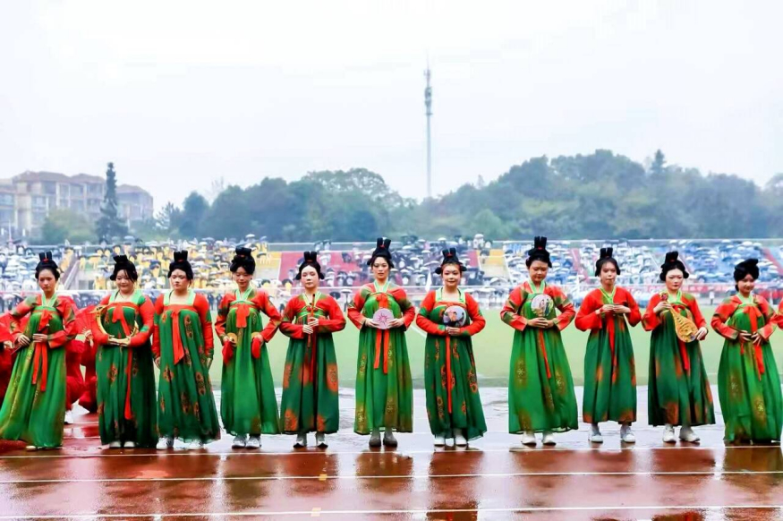 两名舞者手持木笛于方阵前方奏响序曲,身着盛唐襦裙的舞者款款而来。青黛裙摆绣缠枝莲纹,橘红镶边流转如霞,发髻簪翠、额点花钿,尽显仕女娇憨灵动。她们轻摇团扇、拨弄琵琶,与木笛悠扬交织,舞步间红袖翻飞、衣袂蹁跹,或摹古卷、或弄团扇,与红衣学子默契呼应。鼓点渐密时队形如星河变幻,红绿相映生机盎然,恰似活起来的《簪花仕女图》,将盛唐雅致灵动的风华在赛场铺展,尽显附院师生昂扬向上的精神风貌。