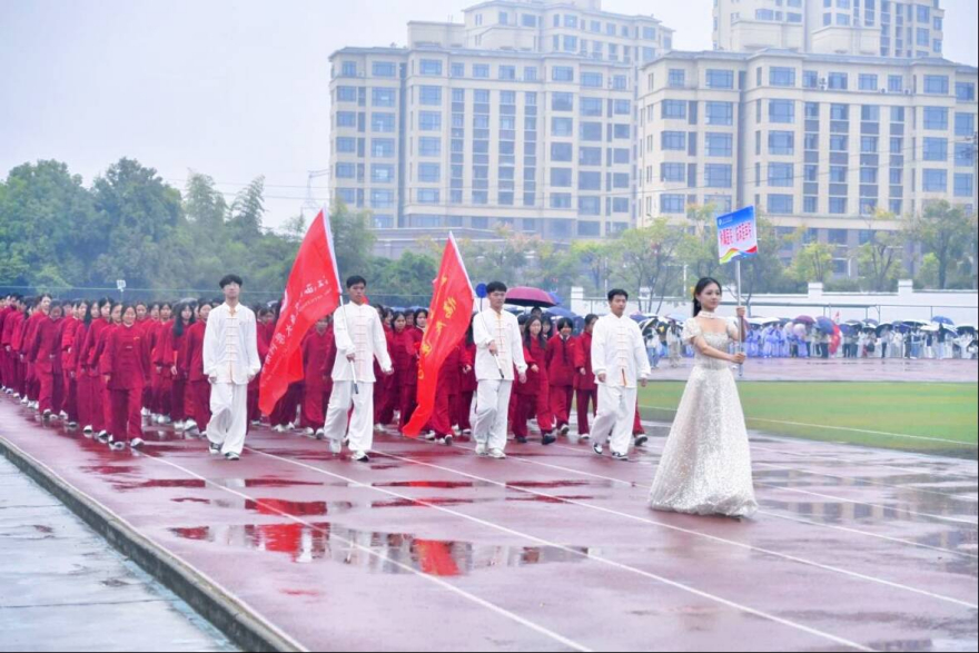 “传承岐黄之道,护佑百姓健康”,在举旗手的带领下,临床医学院学子身着红色太极院服,手持红扇,目光如炬地走在队伍前方。附属医院老师们则紧随其后,神情坚定,眼神中满是对学子们的期许与信赖。方阵站定,同学们迅速展开手中的红扇,向两边散开,为舞者空出施展的舞台。