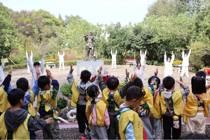 随后,孩子们来到学校“神农园”,走入园中,缓缓映入眼帘的是神农雕像广场上功法队队员们的八段锦表演——动作刚柔并济、行云流水,引得孩子们好奇围观,纷纷上前模仿比划。志愿者为小朋友开展“眼看手勿动,鼻闻嘴不尝”的安全理念教育,在志愿者的引导下观察草药形态、轻嗅气味、触摸质感,亲手触摸薄荷、含羞草等,感受自然与医药的奇妙联结。幼儿园带队老师感慨:“这样的体验让中医药文化‘活’了起来,孩子们在游玩中理解了传统文化的价值。”