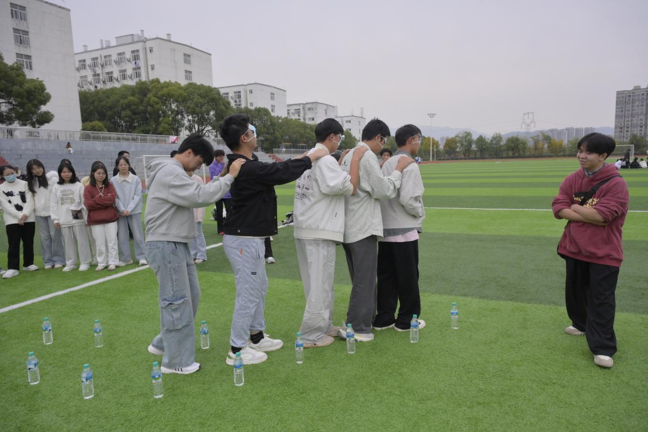 本次活动精心设计了“盲人过河”、“你来我往”与“逃脱困境”三个核心环节,集趣味性、协作性与教育性于一体,吸引了众多同学踊跃参与。在“盲人过河”环节,五位同学排成一列,前四位同学蒙眼,由队尾的同学用拍肩指令指挥前进,同学们在信任与协作中稳步前行。在“你来我往”环节,同学们积极组词、默契配合,通过游戏深刻体会到了团队协作的重要意义。“逃脱困境”游戏将活动气氛推向了高潮,同学们五人一组,互相配合、齐心协力越过绳圈,在突破挑战的同时,收获了满满的成就感。