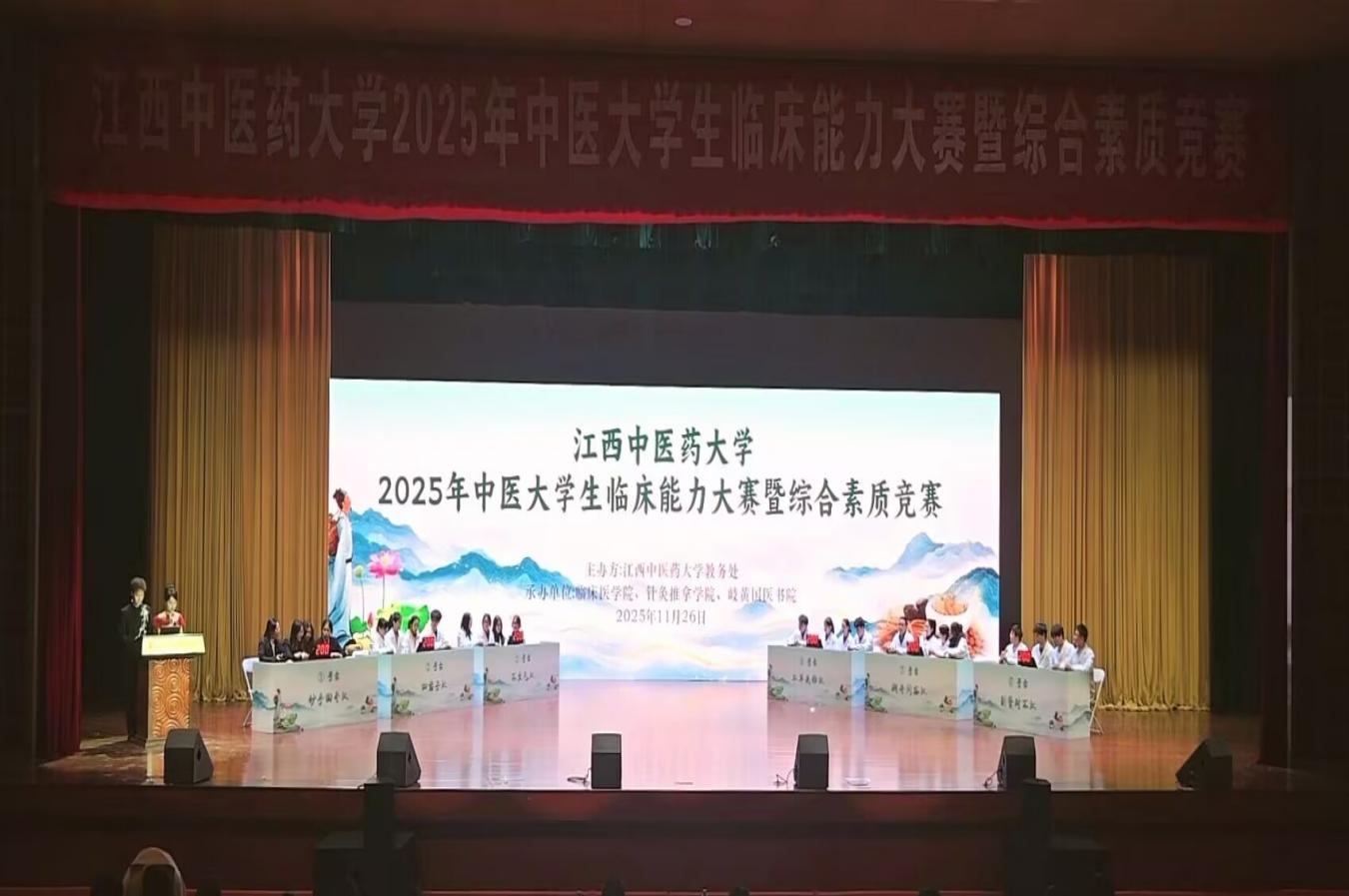 为提升中医大学生临床技能操作水平,推进医学教学改革创新,实现“以赛促学、以赛促教、以赛促改”,11月26日晚,由学校教务处主办,临床医学院、针灸推拿学院和岐黄国医书院共同承办的2025年中医大学生临床能力大赛暨综合素质竞赛决赛于神曲厅顺利开展。教务处、临床医学院和针灸推拿学院相关负责人出席本次活动。此次大赛特邀临床医学院副院长、江西省名中医王万春,临床医学院副院长、主任中医师刘英担任评委。